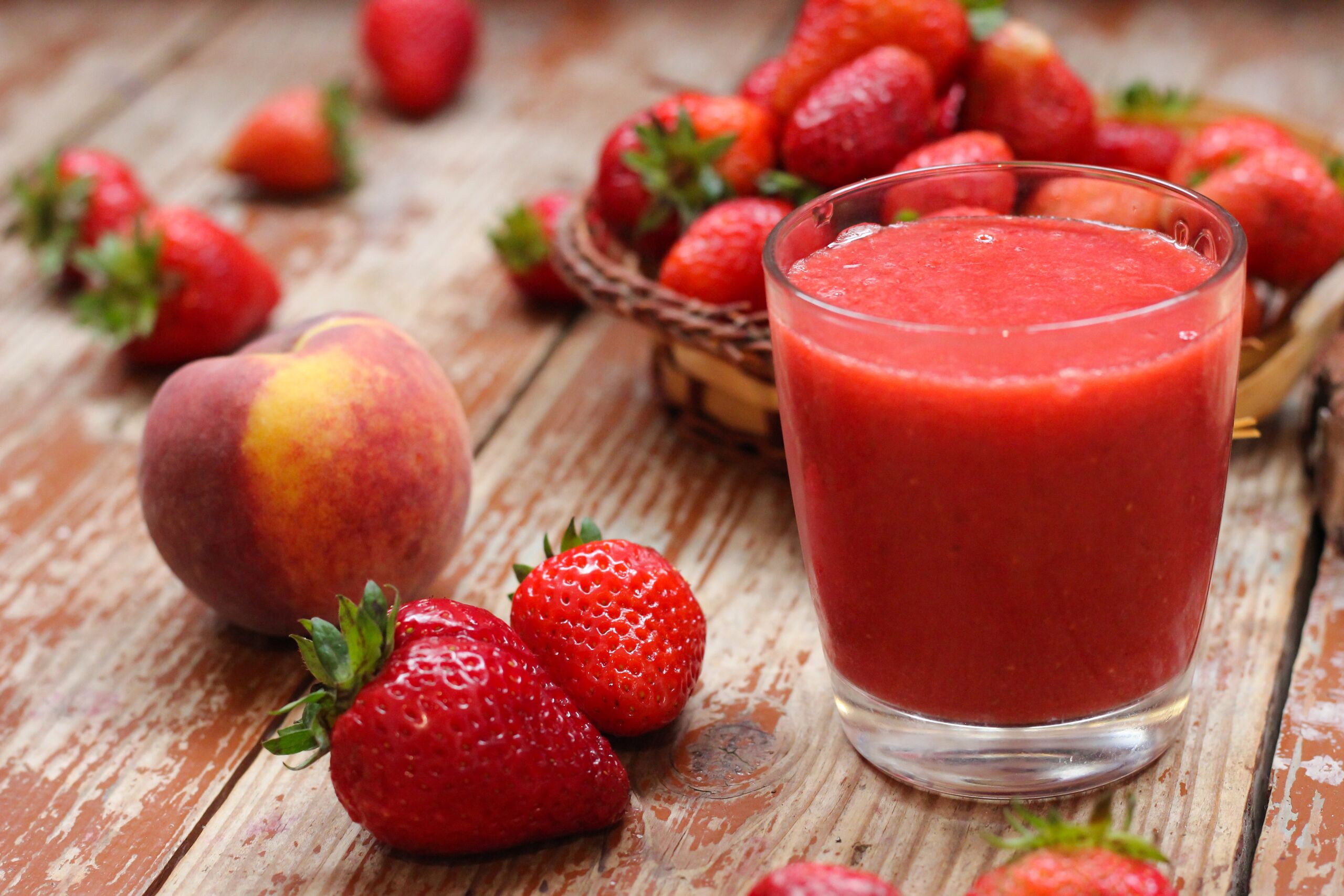Tegyük az almalevet, a joghurtot, az epret, az őszibarackot egy gépbe, majd turmixoljuk simára és kész is.
