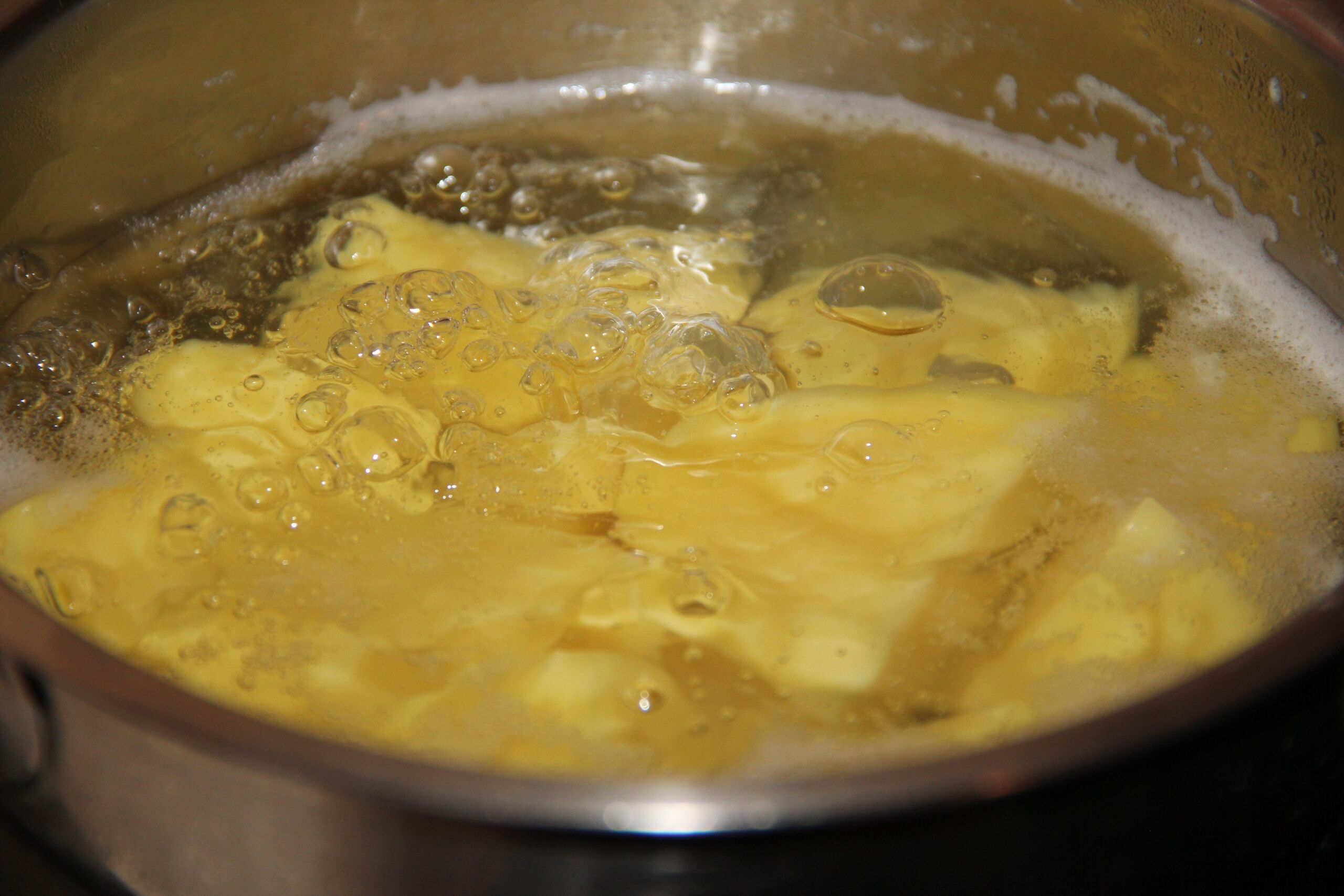 Mosd meg a burgonyát, hámozd meg, majd vágd fel tetszőleges formákra. 1 kg krumplihoz 1 liter vizet forralj fel, ebbe keverj bele fél teáskanál szódabikarbónát és 2 evőkanál sót. Mikor forr, add hozzá a krumplit. Körülbelül 10 percig főzzük, nem kell teljesen késznek lennie, akkor jó, ha a kés már nagyjából belemegy, de még megakad a közepén.