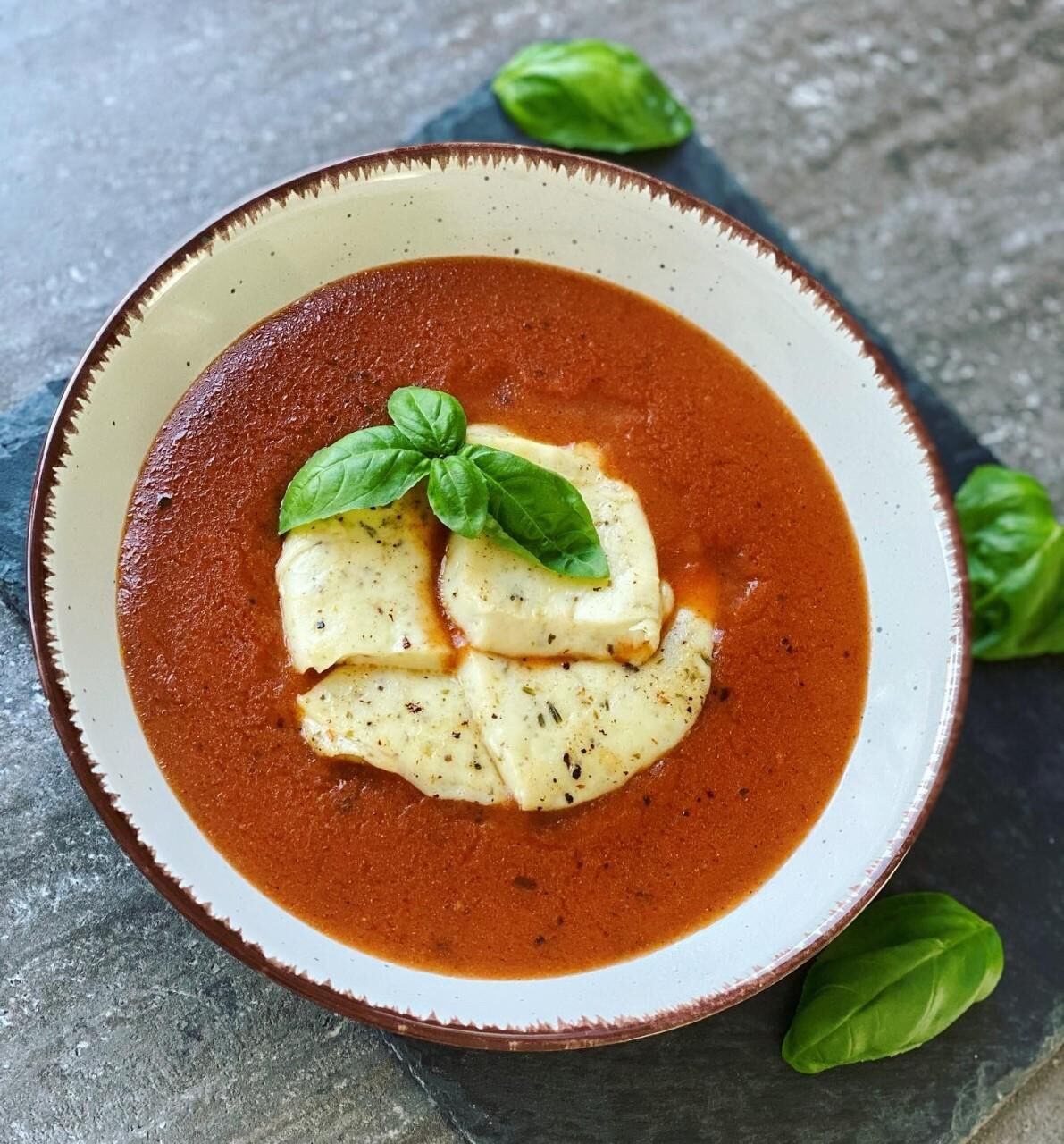 Leves: Paradicsomkrémleves, mediterrán fűszeres grill mozzarellával