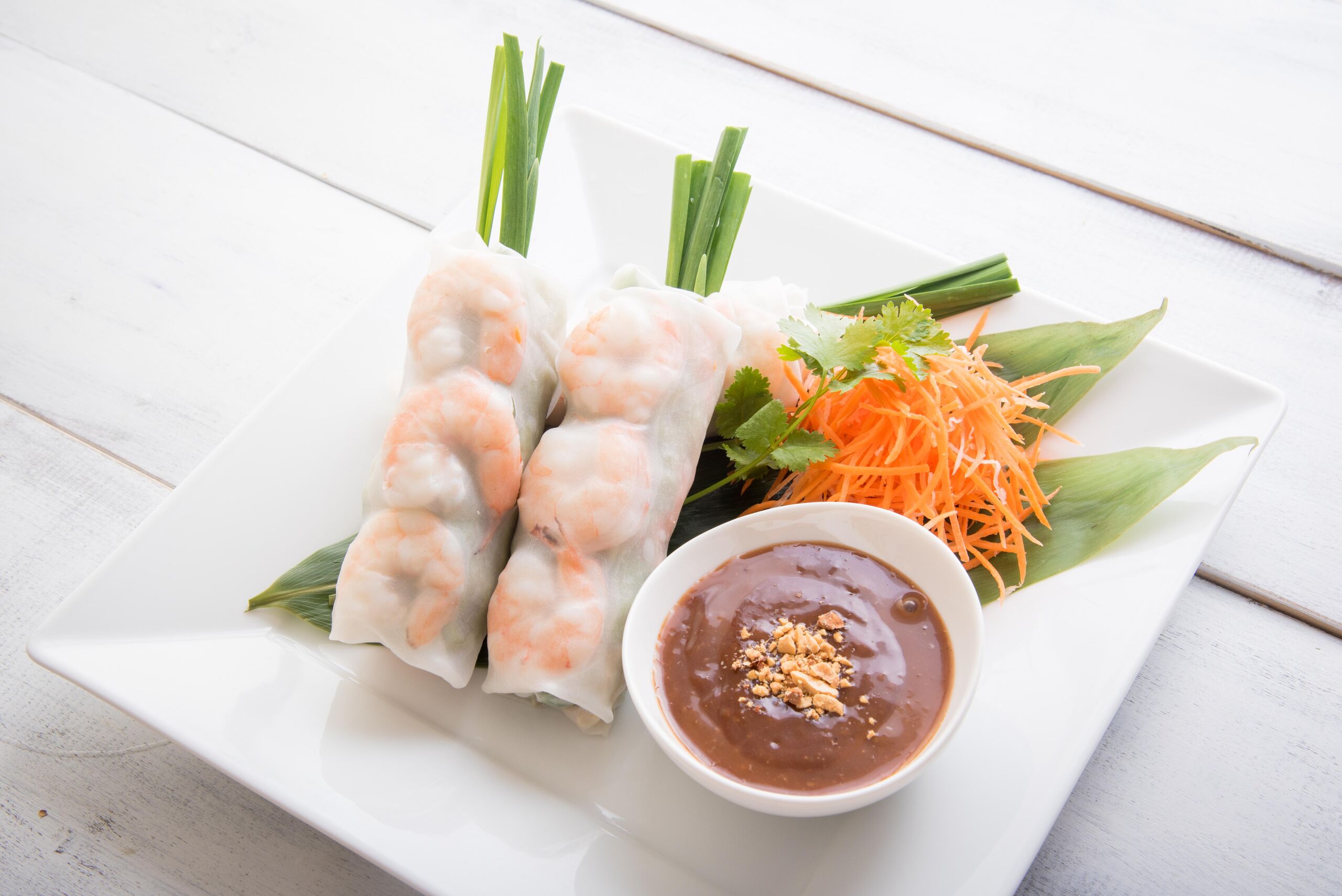 A rizslapra tegyünk azonos mennyiségű üvegtésztát, sárgarépát és kígyóuborkát, azonban ügyeljünk rá, hogy a lapok szélétől legalább 3 centiméter távolságra már ne helyezzünk hozzávalókat, különben nem tudjuk összehajtani. A zöldséget tetejére tegyük a garnélarák méretétől függően annyit, amennyi még nem akadályoz abban, hogy a rizslapot feltekerjük. A megtöltött lapokat szorosan tekerjük, széleit behajtjuk, így biztosan nem fog kiesni a töltelék.