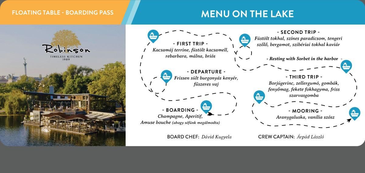 A Floating table, vagyis Úszó asztal ötlete az 1989 óta a Városligeti-tó partján üzemelő Robinson étterem tulajdonosának, László Árpádnak a fejéből pattant ki. A tavalyi rövid időszak tulajdonképpen egy próbaüzem volt, ám a kezdeményezés akkora sikert aratott, hogy idén májustól teljes fordulatszámon folytatják.