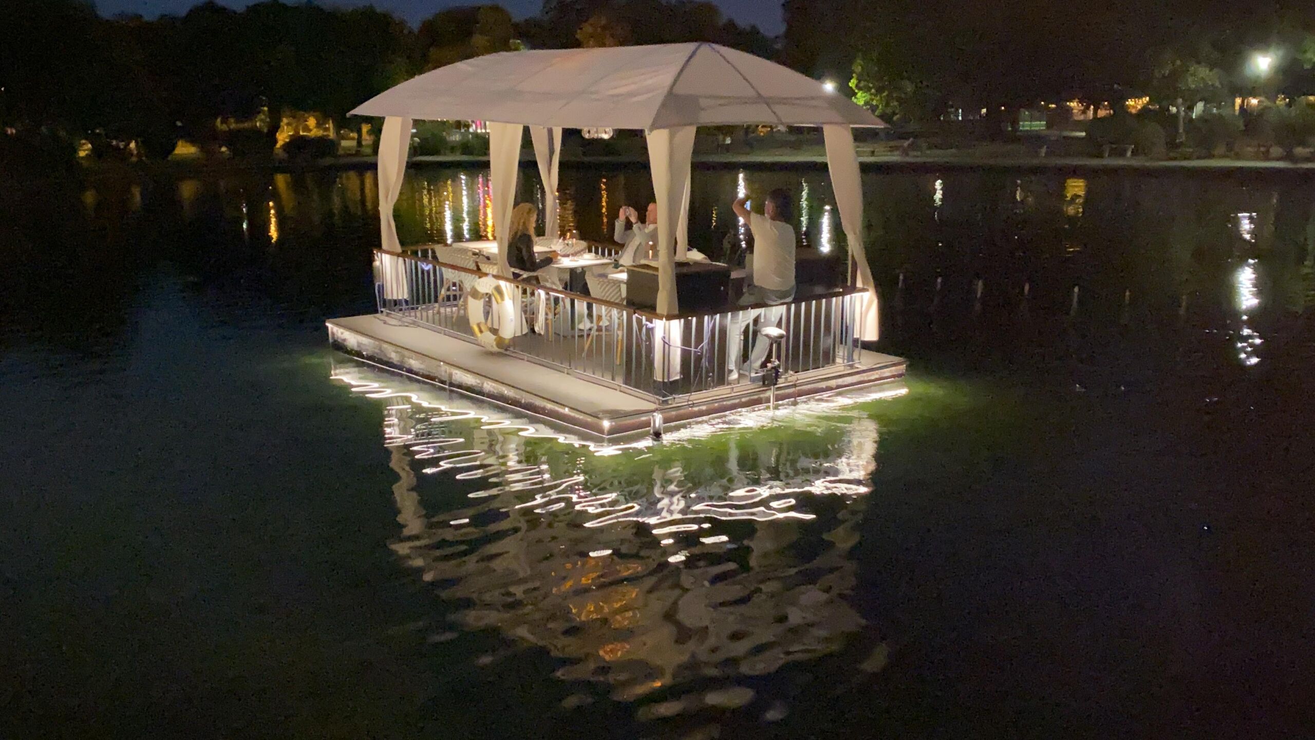 Tavaly augusztusban egy különleges járműre lehettek figyelmesek a Városligeti-tó körül sétálók. A Vajdahunyad vára előtti csónakázó tó kis színes műanyag hajói régóta hozzátartoznak a látképhez, de a tónak az állatkert felé eső oldalán csendben sikló elegáns „valami” nem megszokott látvány: egy jókedvű társaság egy hosszú asztalnál ülve fogyasztja éppen a vacsoráját.
