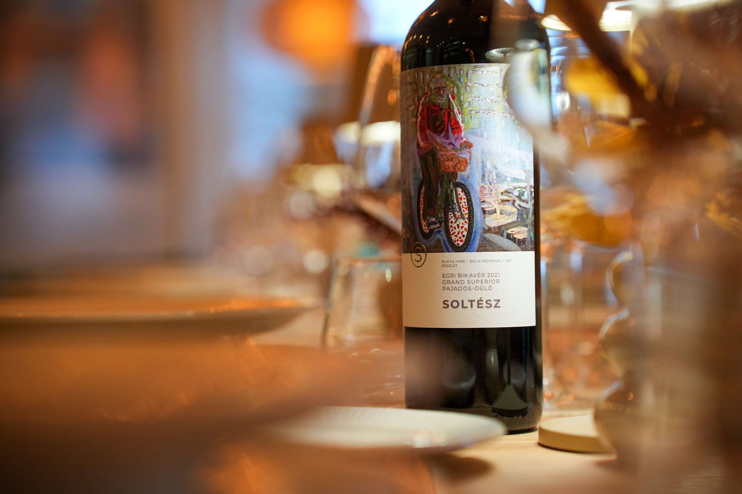 TÉ: Az első ember, akinek elmondtuk, az étteremnyitás lehetőségét, Ipacs Géza volt. Több éve dolgozunk együtt a borászat kapcsán és a munka kapcsolat mellett nagyon jó baráti viszonyt is ápolunk. A belső tér kialakításában is tudatos döntések születtek. Géza ötlete volt, hogy ne klasszikus értelemben vett festmények kerüljenek a falra, hanem a Bukta Imre munkáiból készült borcímkék jelenjenek meg. Ez egyszerre vizuális elem és tartalmi állítás is. Még inkább a bor felé tolja a hangsúlyt. Így a név és a design együtt egyértelmű pozicionálást ad.