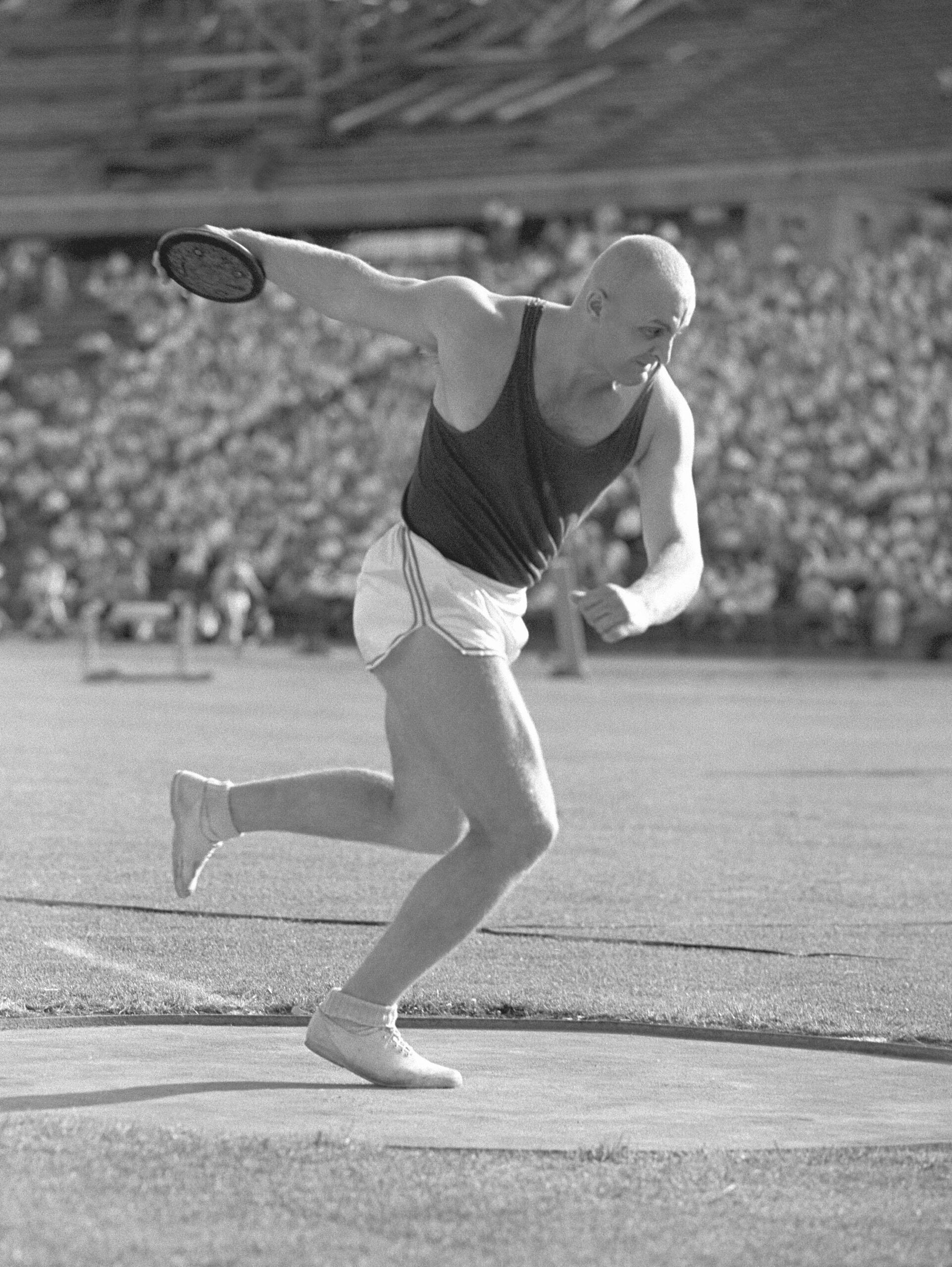 Szécsényi József (Honvéd), a férfi diszkoszvetés győztese dobás közben a Népstadionban rendezett nemzetközi atlétikai verseny második napján. Fotó: MTI