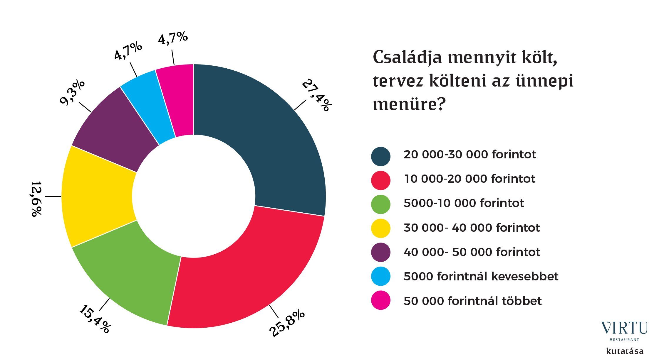 A „hol” mellett a legfontosabb kérdés minden bevásárlás esetében a „mennyiért”: a legtöbben (a válaszadók 27, 4%-a) 20-30 000 forintot szán az ünnepi menüre. Kicsit kevesebben, nagyjából minden negyedik magyar 10-20 000 forintban határozza meg a bevásárlásra szánt keretet, 15,4% csak 5-10 000 forintot tud erre fordítani. 12.65%-uk a fentieknél többet, 30-40 000 forintot tervez rákölteni, 9,3% 40-50 000 forintban határozta meg a felső limitet.