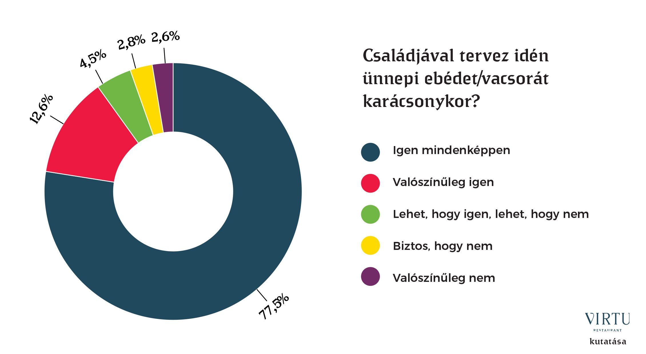 A VIRTU kutatása alapján a magyarok családcentrikusnak és összetartónak tűnnek: megkérdezettek 77,5 százaléka biztosan részt vesz közös ünnepi ebéden vagy vacsorán karácsonykor, ami kiemelkedően magas szám.