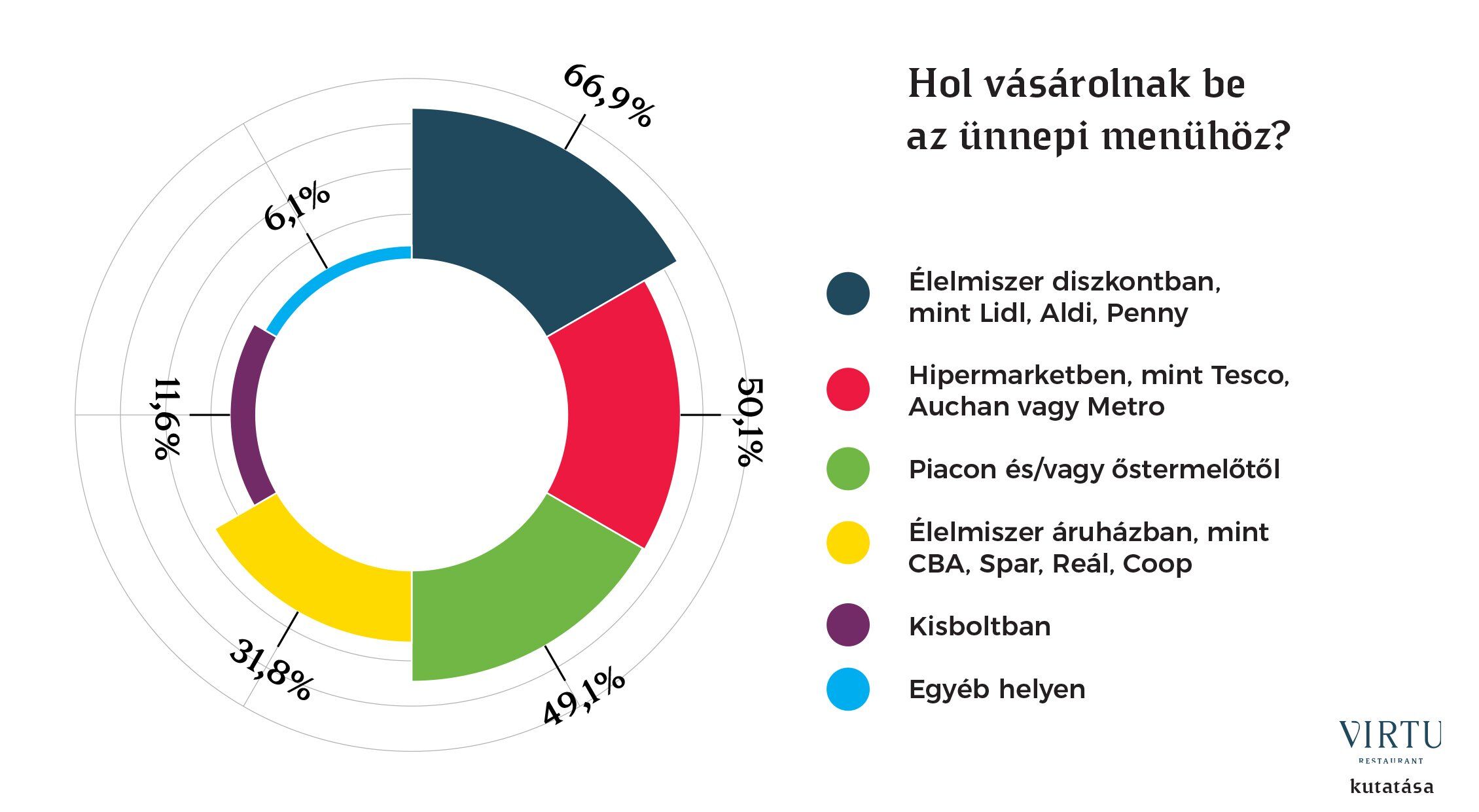 A tervezett bevásárlás helyszíne sem okozott meglepetést. A válaszadók több üzletet is megjelölhettek. Az élmezőnyben a nemzetközi élelmiszerdiszkontok végeztek: a magyarok a karácsonyi vásárlást 66,9%-ban a Lidl, az Aldi vagy a Penny valamelyik üzletében ejtik meg. A második helyen, 50,1%-kal a hipermarketek végeztek, itt a Tesco, az Auchan vagy a METRO szerepelt. Magas a piacon és őstermelőktől vásárlók aránya, 49,1%-kal alig marad el a hipermarketek mögött.