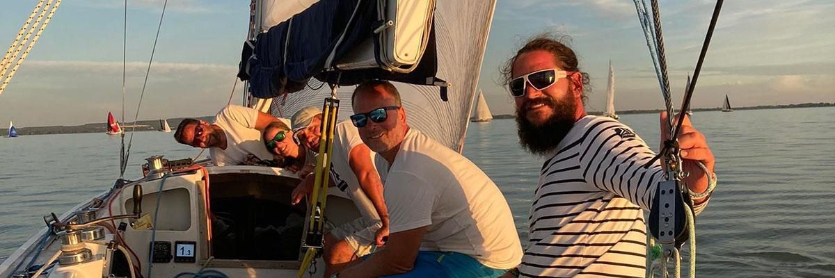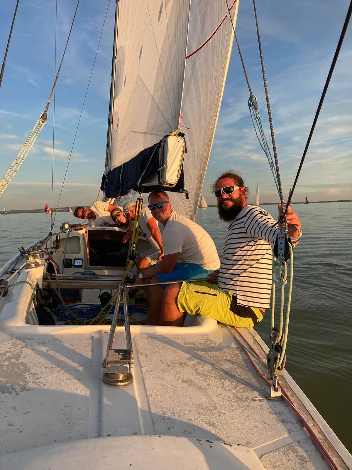 Délben beszéltünk először a Honfoglaló legénységével, akkor éppen a tihanyi tornyok bukkantak fel előttük és nagyon elégedettnek tűntek. A kedvük azóta is töretlen, ez a fenti képből is egyértelműen kiderül, bár volt egy kisebb koccanásuk a vízen, megsérültek a csigáik, a kormányosuk még a vízben is járt. Most viszont már túl vannak a keszthelyi fordulón és szeretnének éjszaka beérni.