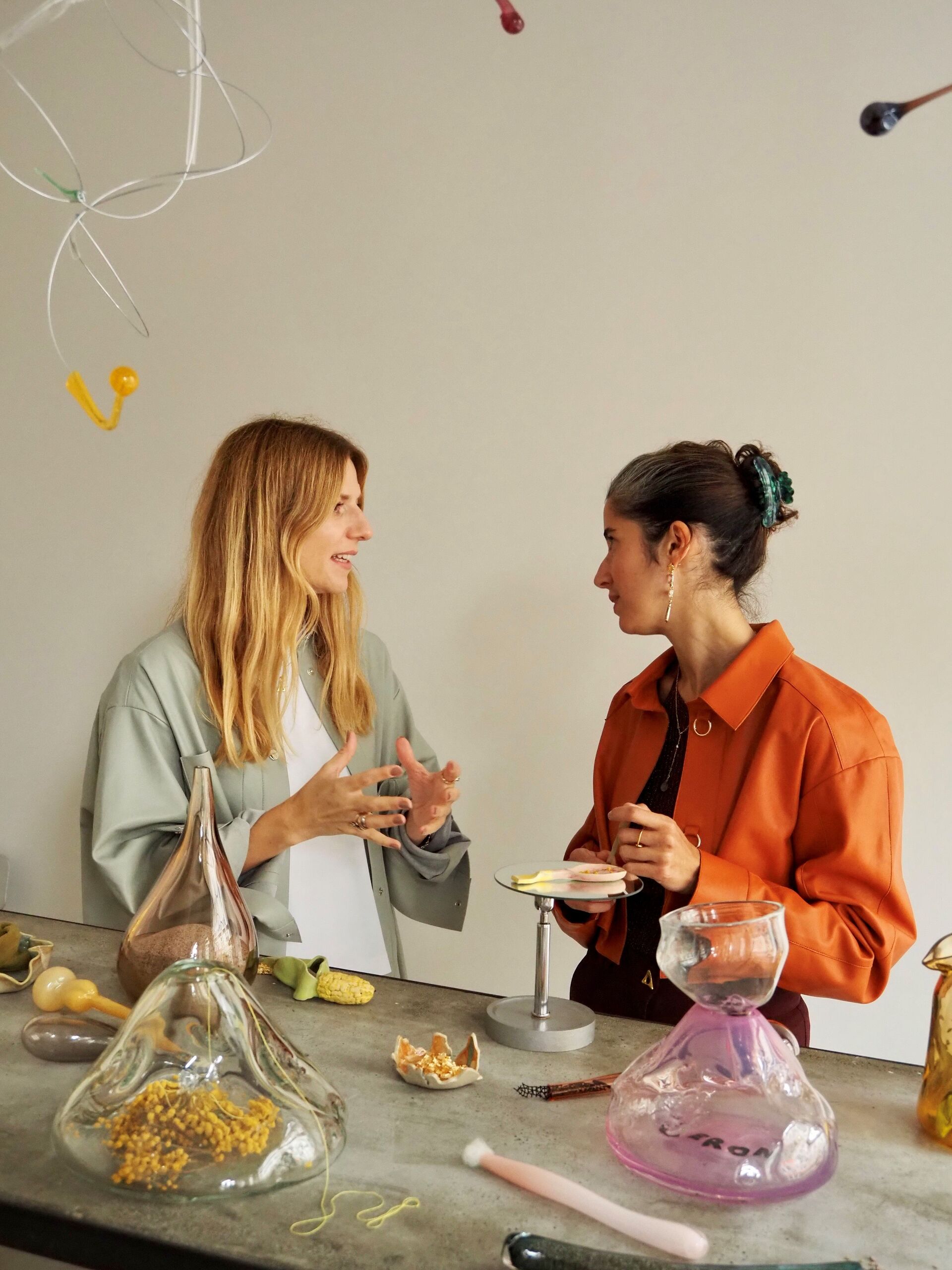 A kézzel készült üvegek, és naivan formált porcelán tárgyak egytől egyig az AERON világára utalnak — a dán homok például a márka földszíneire, a Budapest térkép a brand otthonára reflektál absztrakt módon.