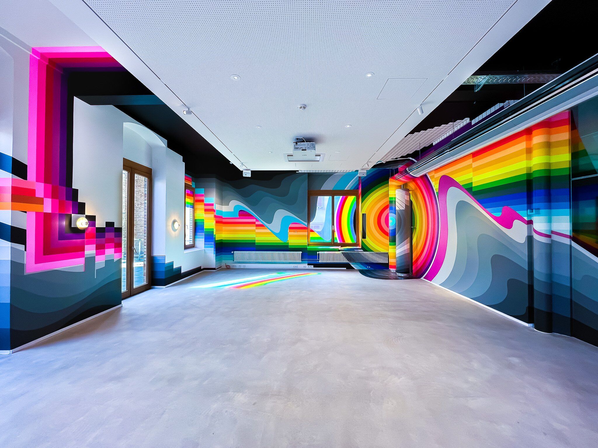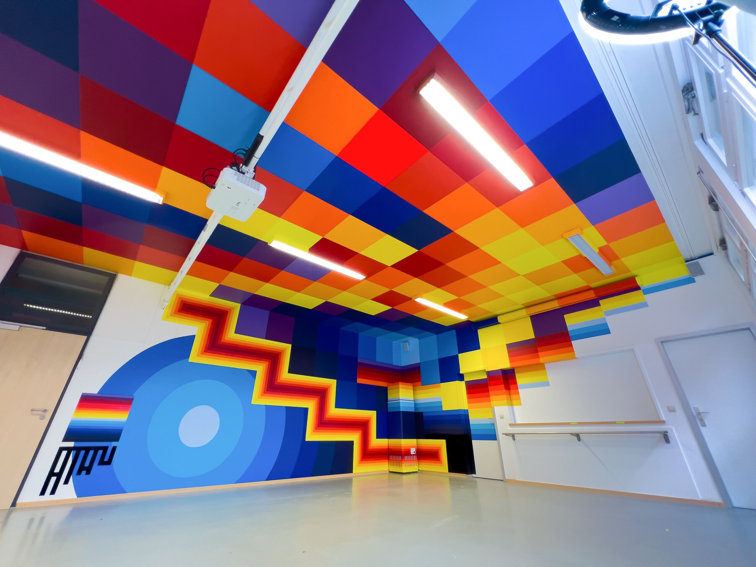 Once we have an agreement, I try to create something that fits the space, but with my own aesthetics. My artworks are not museum artworks, because they are in rooms where people work, learn or live. I did a design for a school that specializes in learning methods for children who have problems with their vision. The challenge for this project was therefore to create a room installation that would be exciting for people with and without visual impairments. We needed good color contrasts and big structures there.