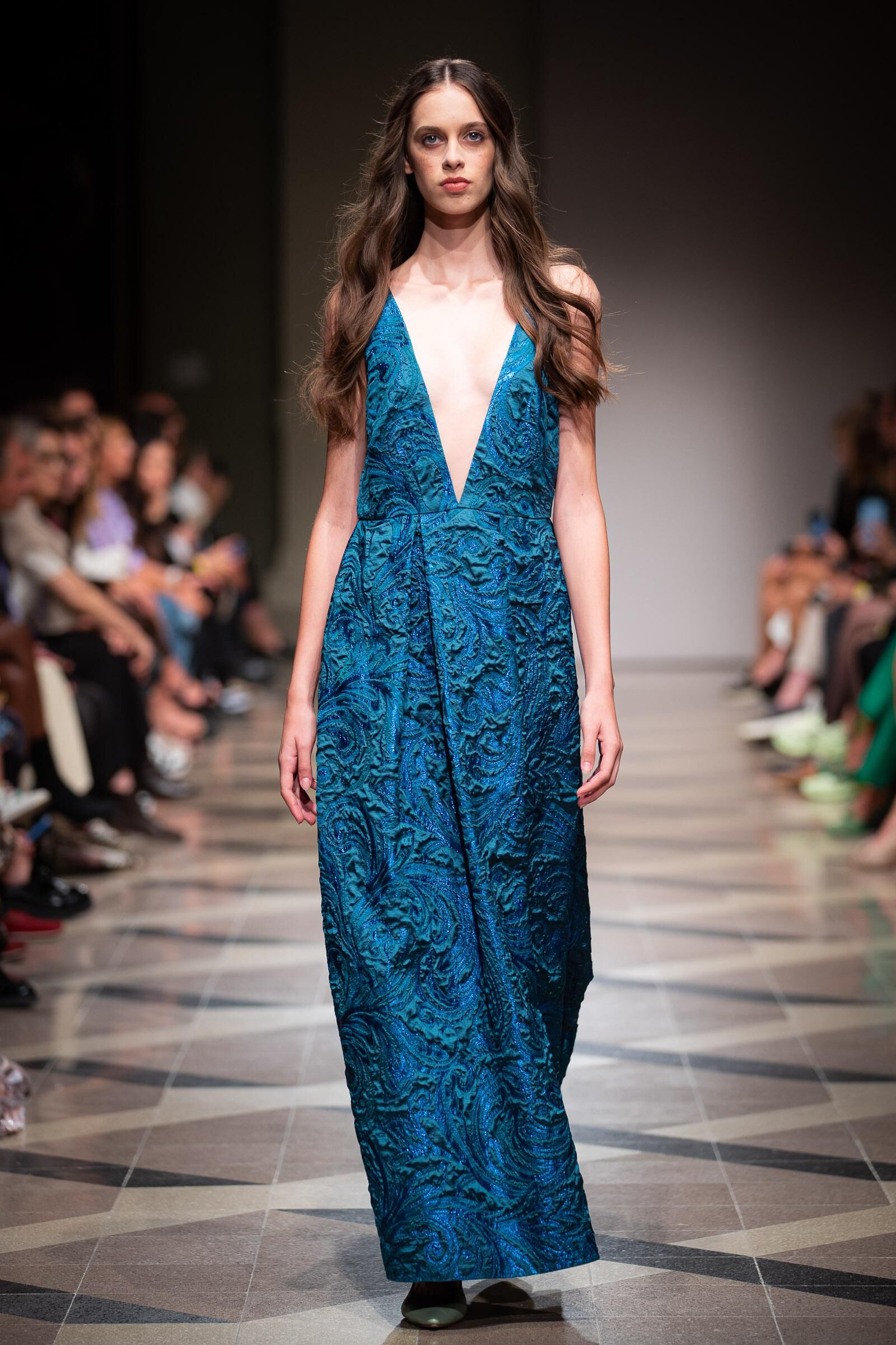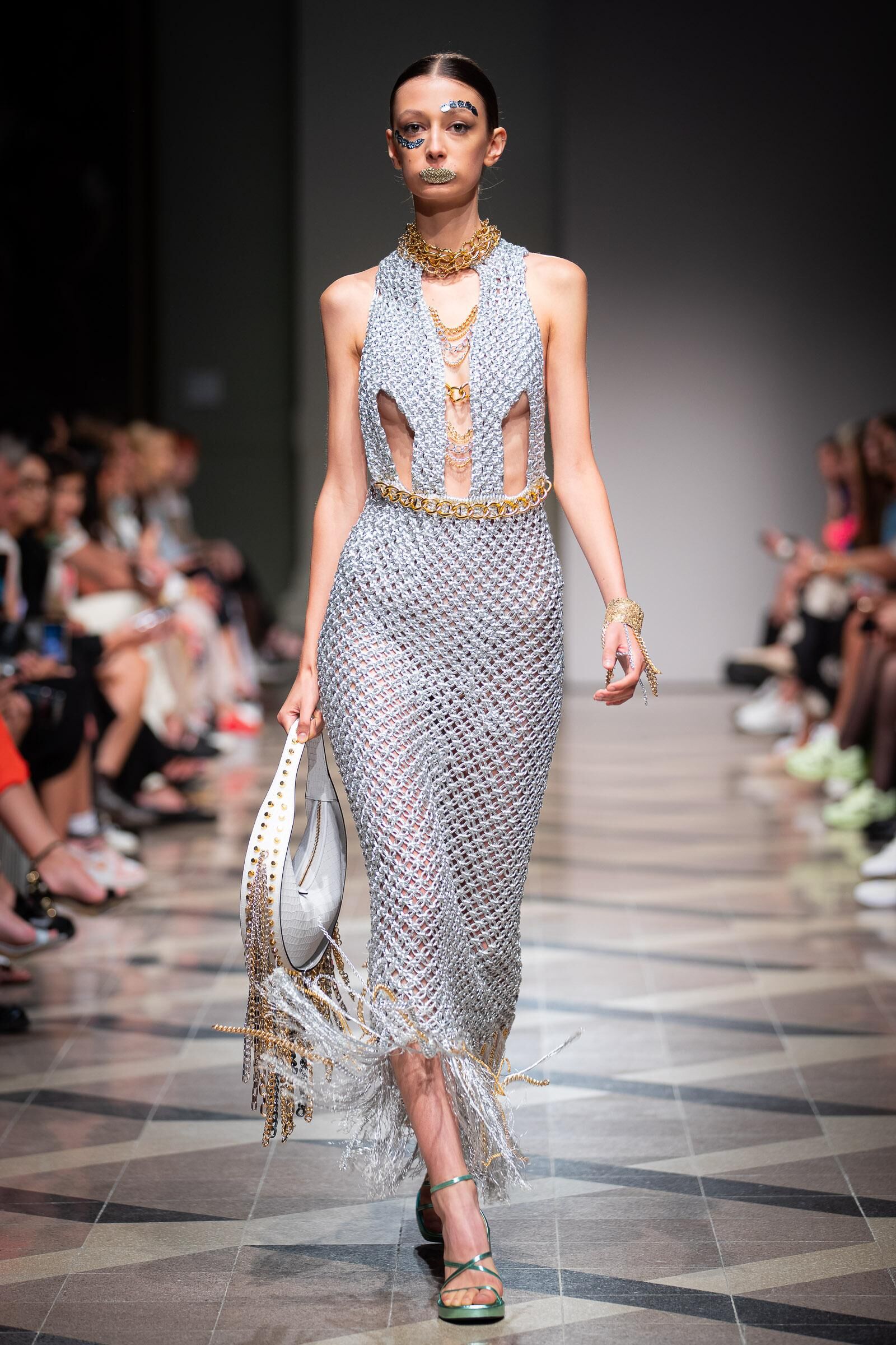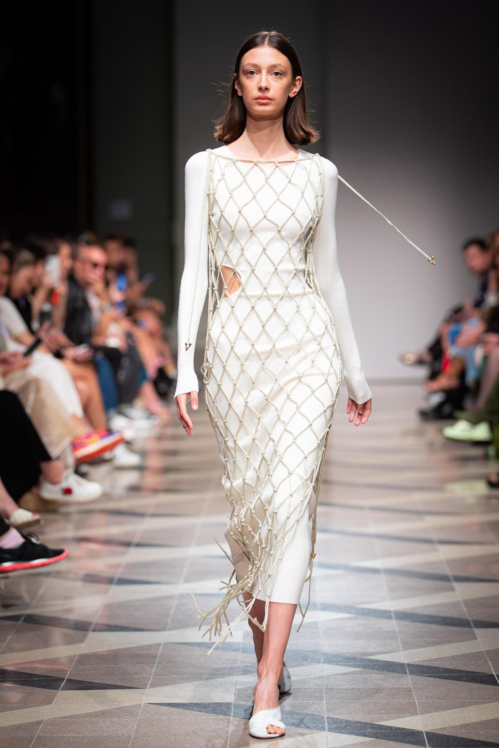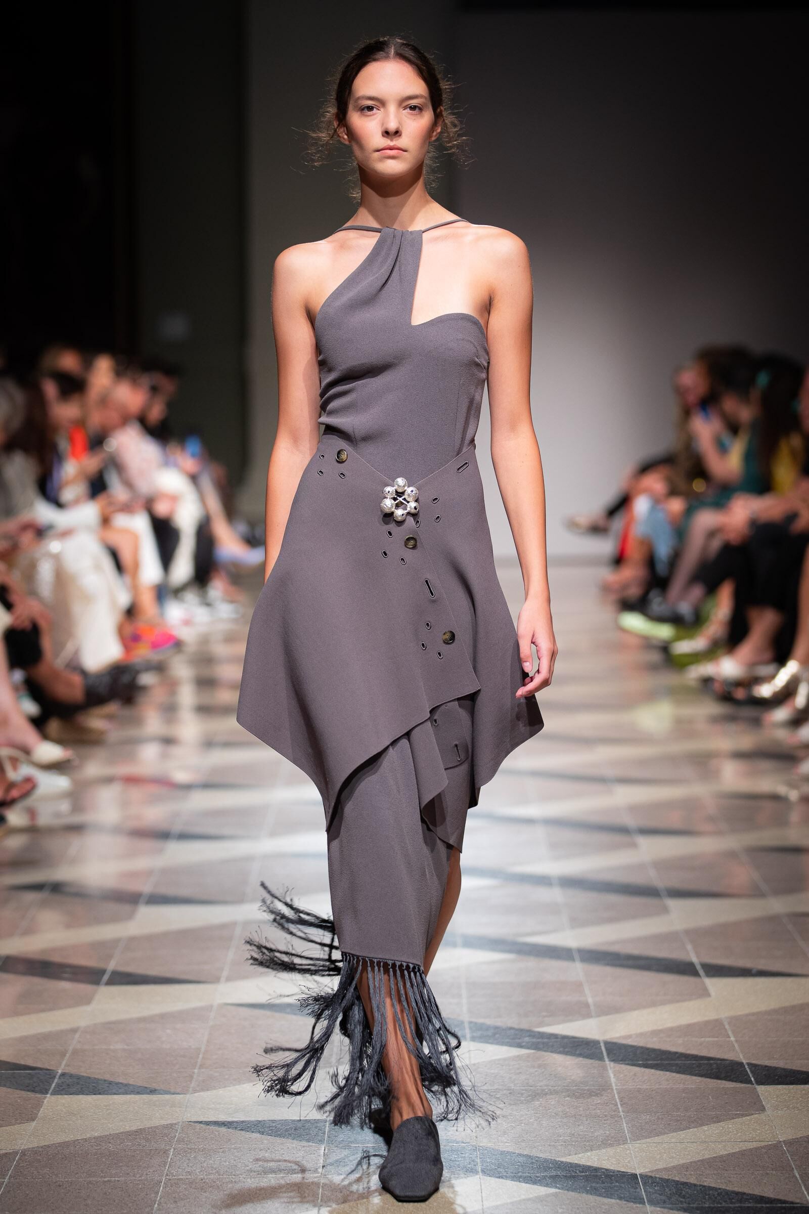 Arra, hogy a szürke mennyire nem unalmas tökéletes példa a Nanushka izgalmas sziluettű, rojtos aljú koktélruhája, mely a kollekció egyik legkiemelkedőbb darabja volt.