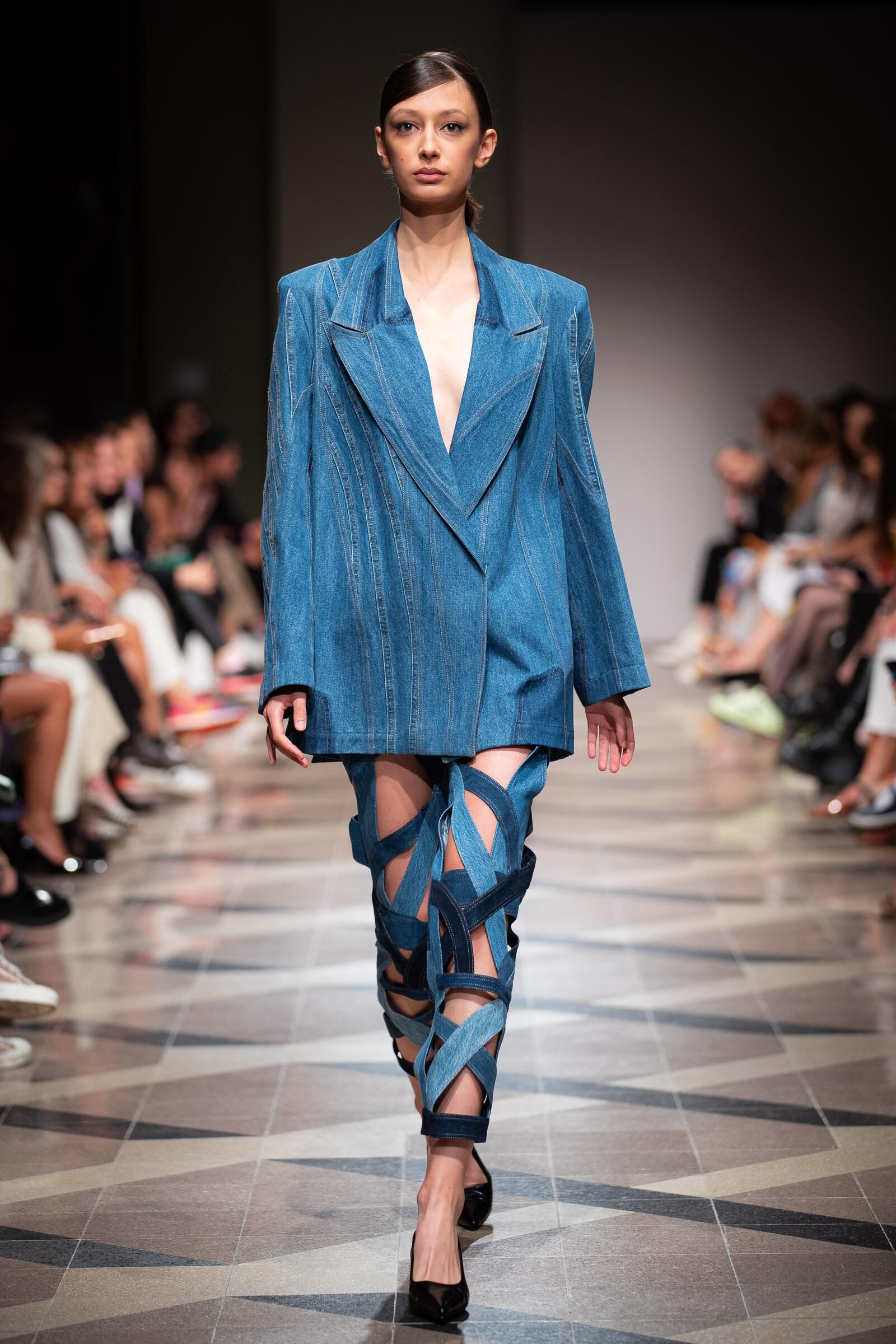 Szegedi Kata túlméretezett maszkulin zakója ezzel a farmerszalagokból alkotott nadrággal erős duót alkot.