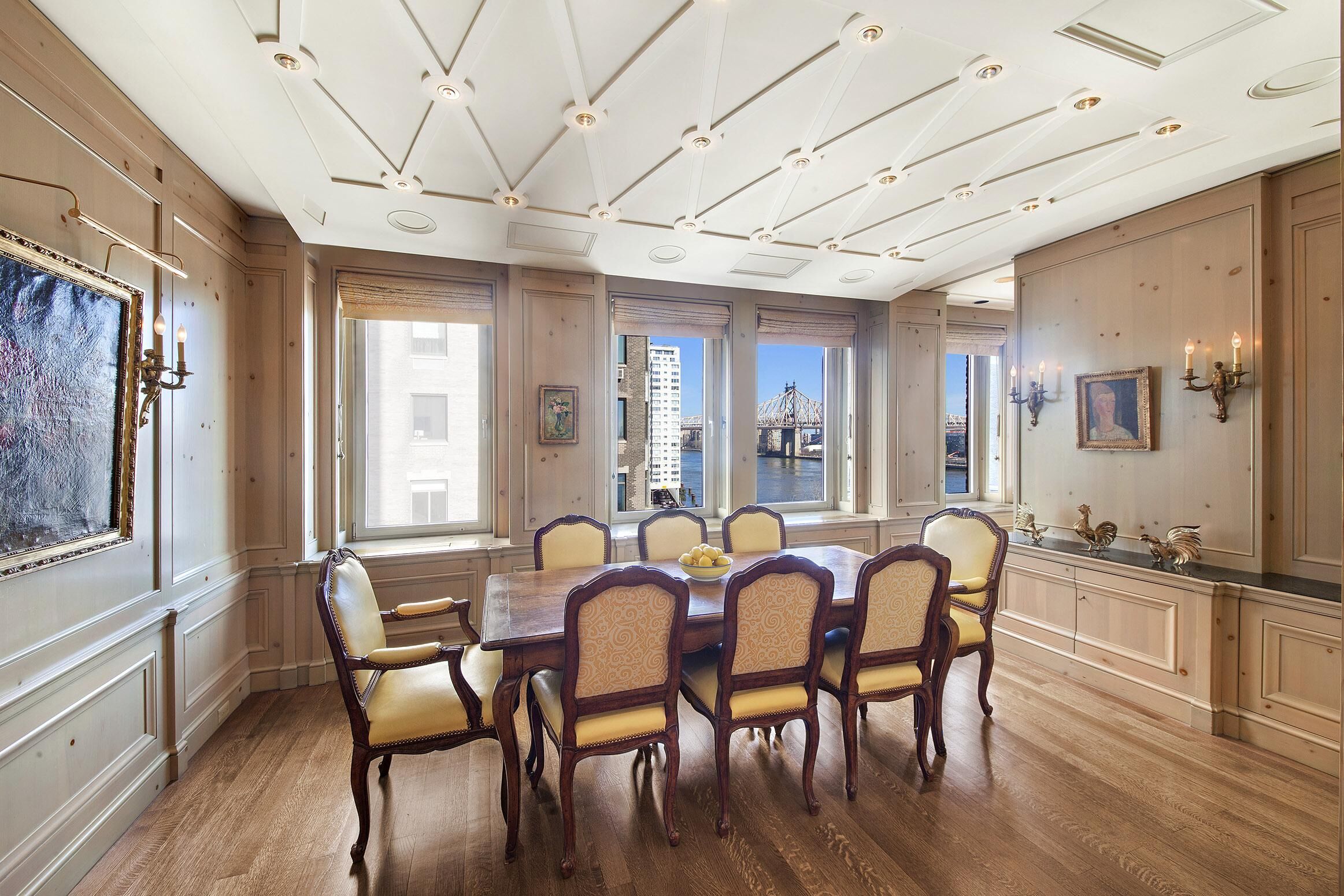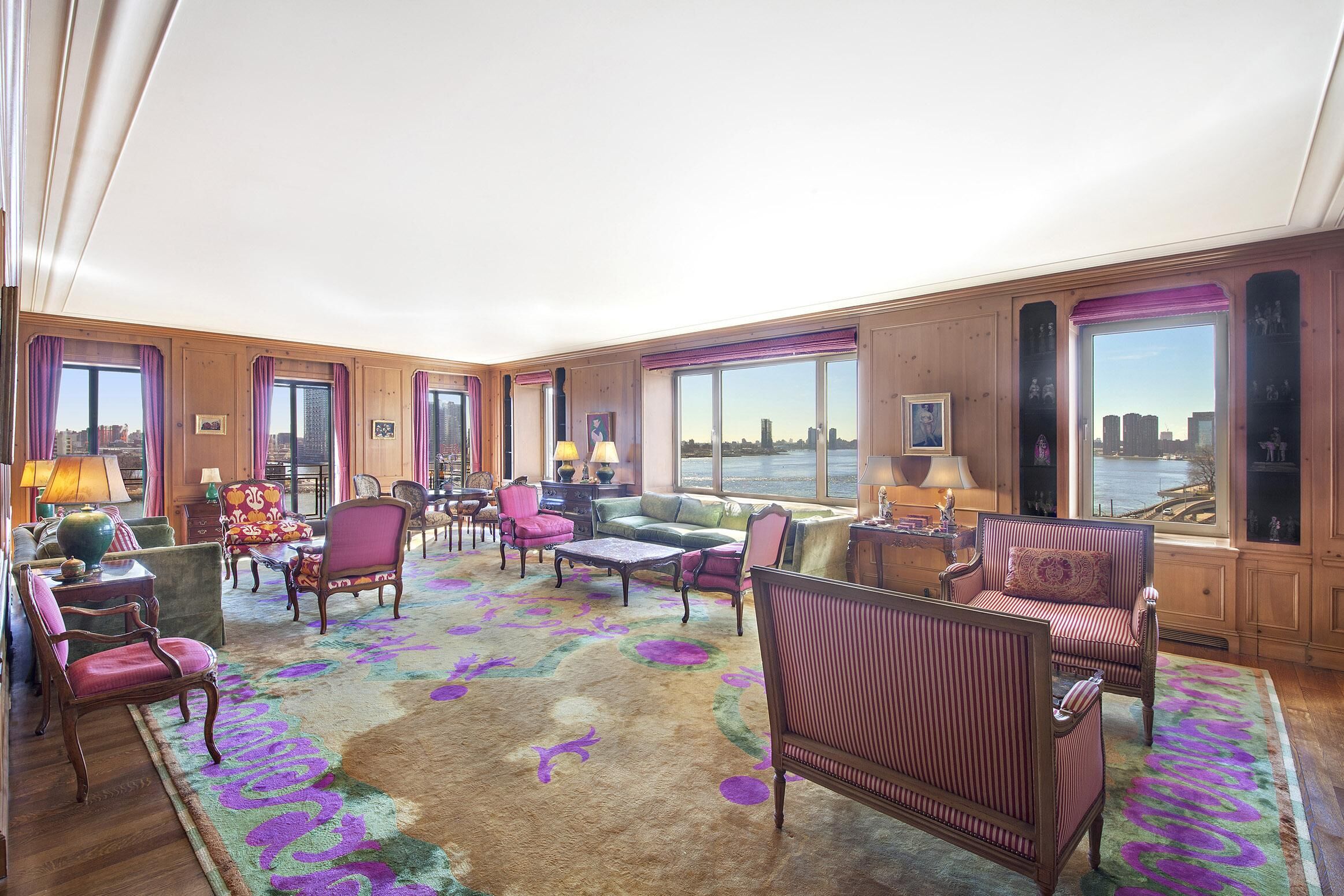Az ingatlan egy privát liftes előcsarnokkal rendelkezik, amely egy galériába nyílik, majd egy L-alakú, faburkolatos nappaliba érkezünk, ahonnan makulátlan kilátás nyílik a folyóra. A pazar szőnyegtekől a drapériáig minden rendkívül elegáns. A nappali volt állítólag Garbo kedvenc helyisége.