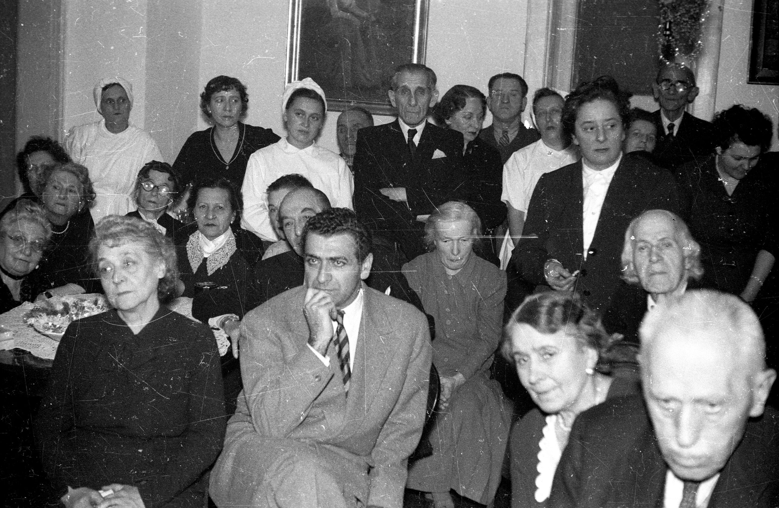 1957: Lendvay utca 13., Ódry Árpád Színészotthon. Világos öltönyben Bárdy György, jobbra feljebb áll Gobbi Hilda, előtte ül Bérczy Gyula színművészek a karácsonyi ünnepségen.