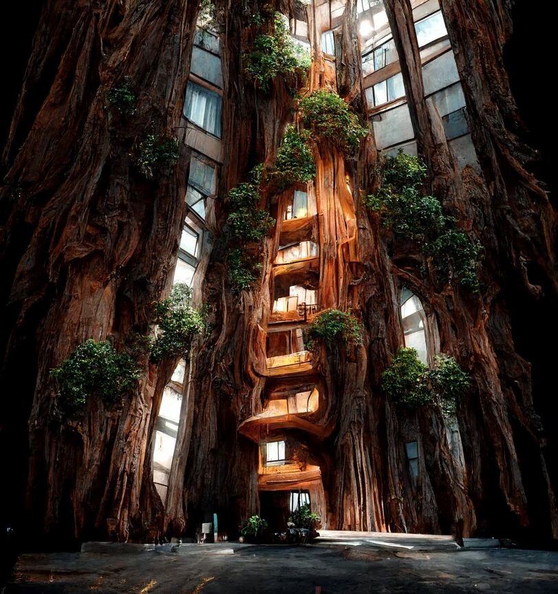 Manas Bhatia építész és számítógépes tervező a Midjourney mesterséges intelligencia (AI) eszközben rejlő lehetőségeket kihasználva egy szürreális építészeti jövőt képzel el új projektjében, a Symbiotic Architecture-ben. A Hyperion fa által inspirált koncepcióban az indiai tervező egy olyan jövőt képzel el, amelyet szimbiózisban élő építészeti lakótornyok laknak, amelyek lélegeznek és növekednek, és óriási üreges mamutfenyőként jelennek meg.