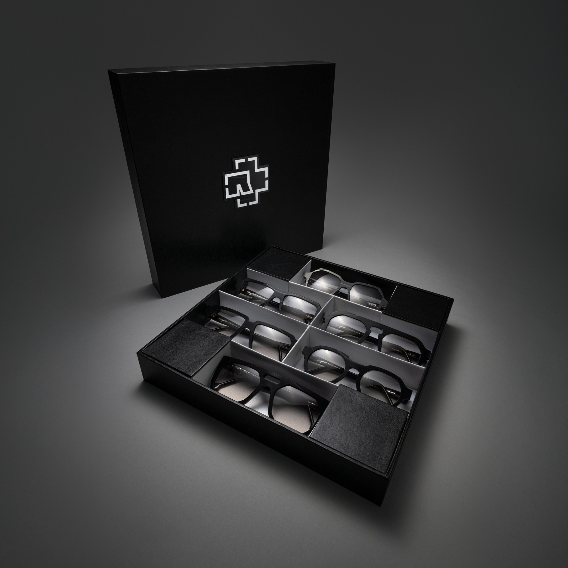 A RAMMSTEIN EYEWEAR formavilágát a minimalizmus uralja: szögletes, funkcionális sziluettek, fekete, szürke és fém tónusok. A hangsúly nem a látványos brandingben, hanem a részletek jelentésében rejlik. Minden modellen megjelenik az „R” betű fix jelzésként a szárakon. A belső felületek ipari névtáblák logikáját követik: logó, modellnév és sorozatszám szerepel rajtuk. Egységes, jellegzetes részlet a szárak hegyén elhelyezett, süllyesztett fekete hangerőszabályzó gomb, amely finom utalás a kontrollra, a gépre és a maximális intenzitásra.