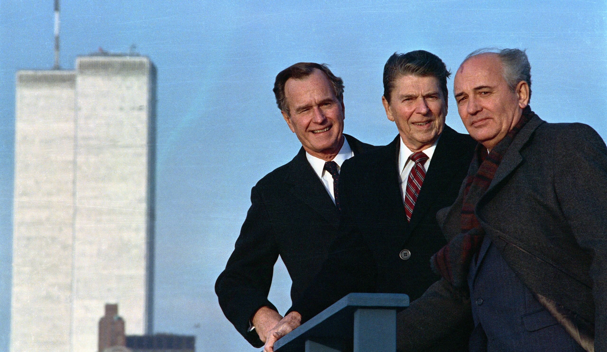 Egy New York-i találkozó után Ronald Reagan elnök, George Herbert Walker Bush alelnök és Mihail Gorbacsov szovjet főtitkár pózolnak a World Trade Centerrel a háttérben.