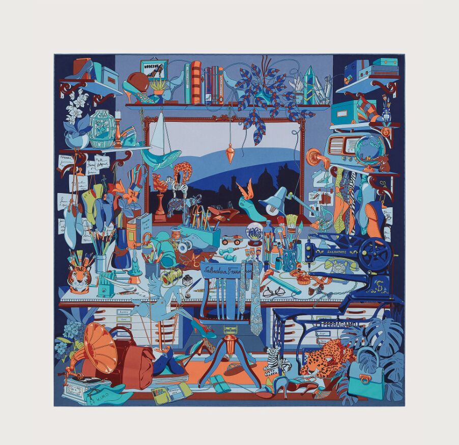 Egy nagyszerű, ám rendetlen műterem képe elevenedik meg – Firenzei kilátással – a Ferragamo selyemsálján, mely egyfajta tisztelgésként született meg a márka alapítója, Salvatore Ferragamo előtt. A művész széke a brand örökségének legikonikusabb elemei között áll – érdemes elveszni egy kicsit a részletekben, mielőtt magunkra kötjük a darabot.