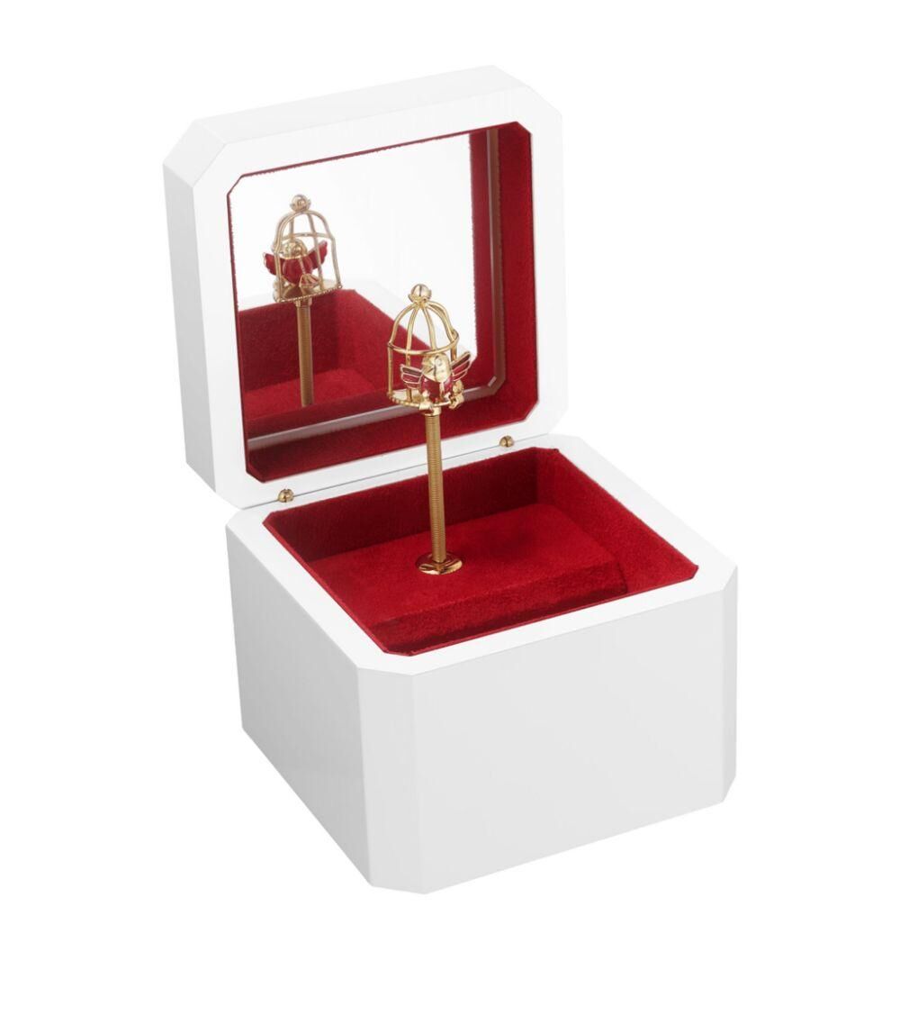 Tökéletes ajándék, egy igazi időtálló örökség a Cartier zenedoboza. Ahogy felnyílik az ékszeres dobozka, feltűnik az ikonikus darabokra emlékeztető piros plüss belső és egy arany madárka, ami a a „La Vie En Rose” dallamára forog körbe és körbe.