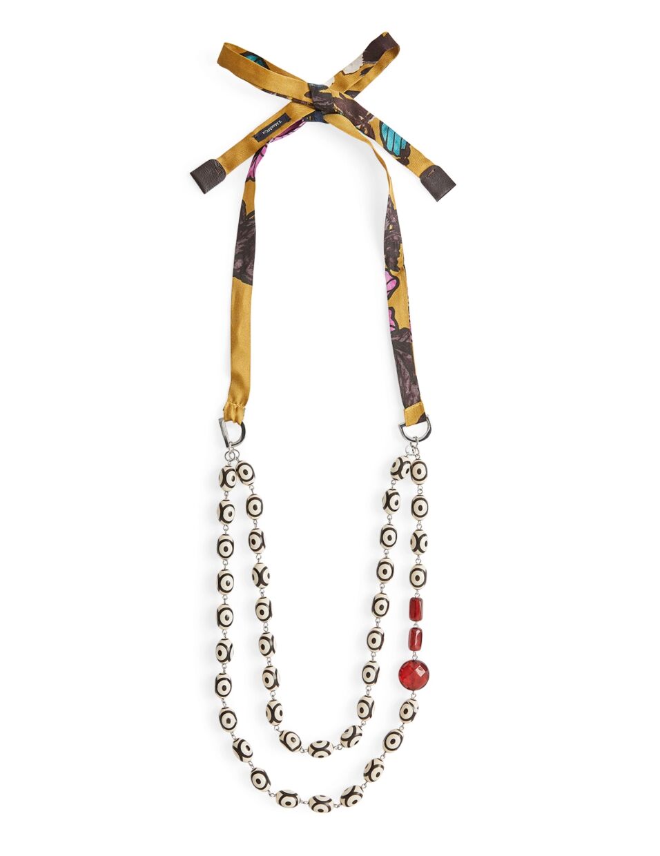 Aki szereti a bohókásabb ékszereket, azt minden bizonnyal azonnal leveszi a lábáról a Max Mara kézműves hangulatú nyaklánca. Az absztrakt kivitelezésű ékszert a gyöngy és a csillogó gyantakristály mellett a színes selyemszalag teszi igazán trendivé.