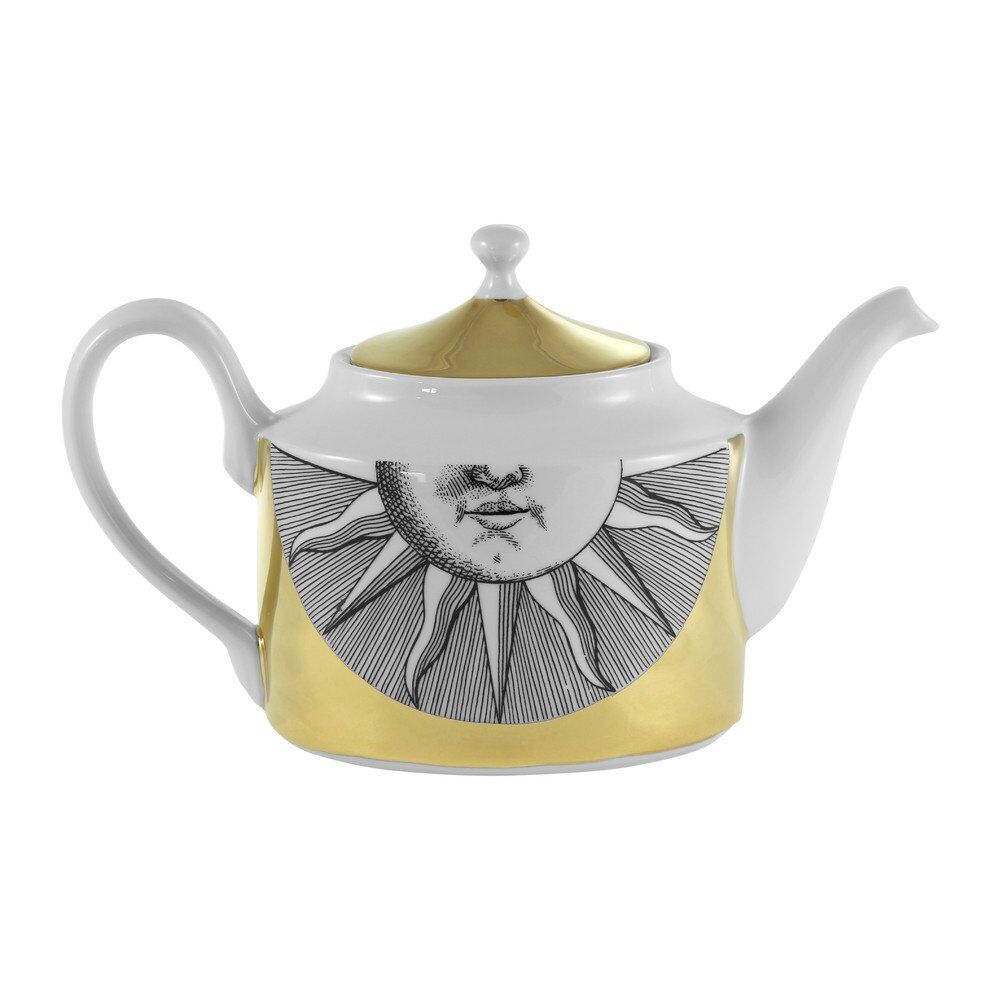 Fekete-fehér napábrázolás, aranyszínű háttérrel: a Fornasetti elegáns teáskannája az étkezőasztalunk dísze lehet és még egy esős tavaszi délelőttön is garantáltan bearanyozza a napunkat. Minden darabot kézzel készítenek Olaszországban, a márkát alapító Piero Fornasetti által kifejlesztett egyedi technológiával.