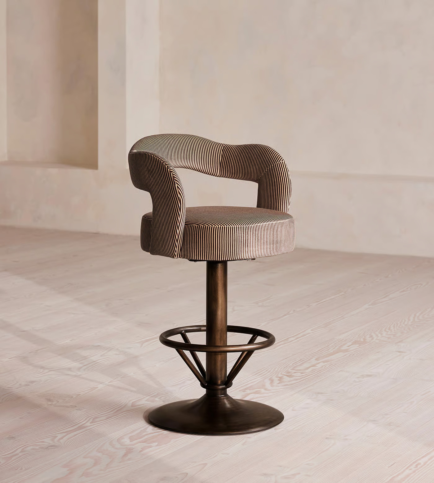 Tömör tölgyfa lábak, réz részletek és bordázott velúrral borított, teljesen kárpitozott ülőrész találkozik ebben a karakteres bárszékben, amely a klasszikus angol klubhangulatot idézi. Ugyanakkor bárhol megállja a helyét – legyen az egy art deco enteriőr vagy egy modern konyhasziget. Csak le kell huppannunk rá egy hosszú nap végén, egy jól megérdemelt koktéllal a kezünkben.