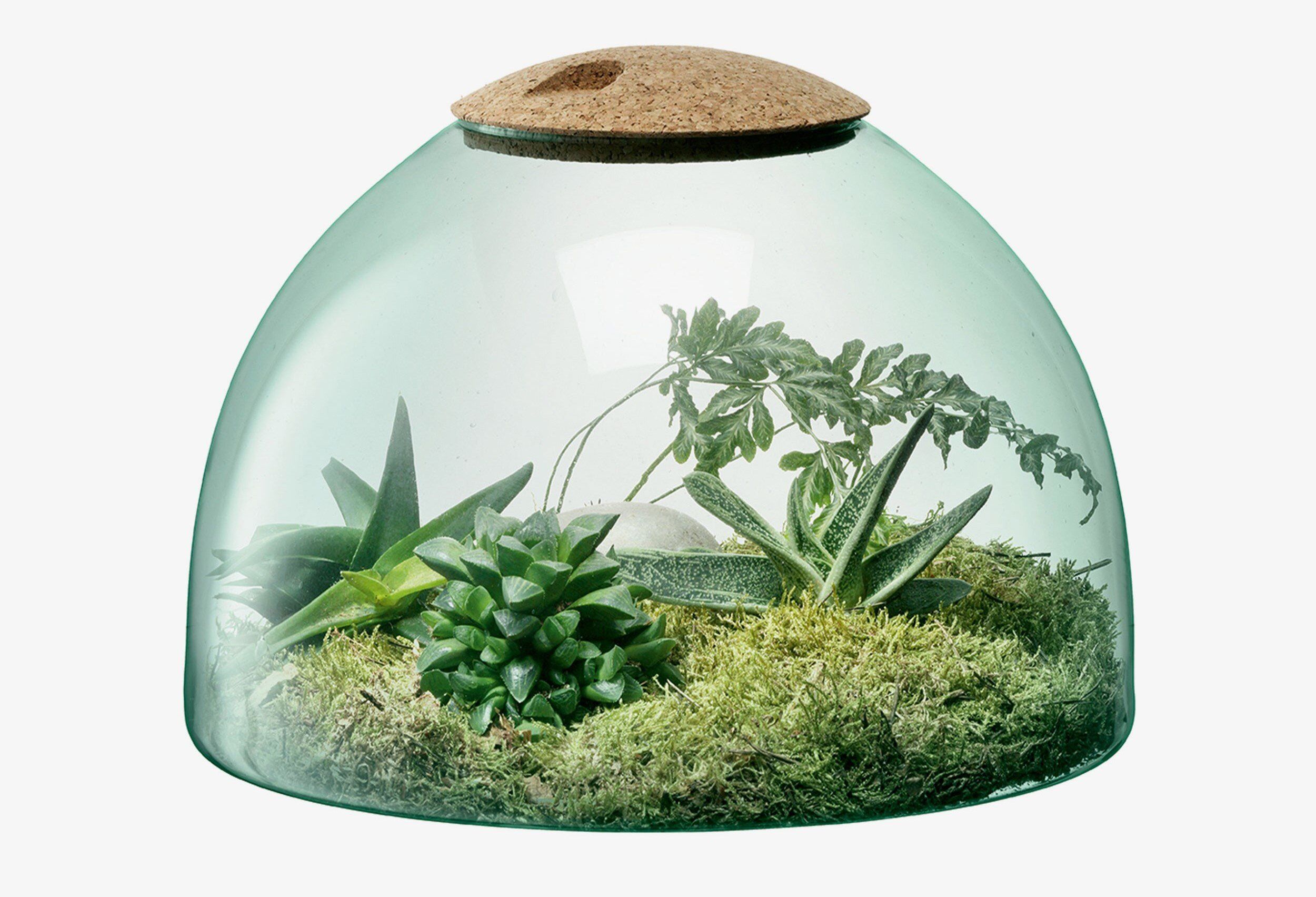 Ha meguntuk a klasszikus szobanövényeket, és valamilyen meglepő beltéri növénydíszt keresünk, egy növényterrárium kitűnő választás lehet. Ezt az újrahasznosított üvegből készült kupolát könnyen levehető parafafedéllel látták el, amit leemelve már el is kezdhetjük létrehozni saját ökoszisztémánkat lassan növekvő pozsgás növényekkel, mohákkal vagy akár kaktuszokkal.