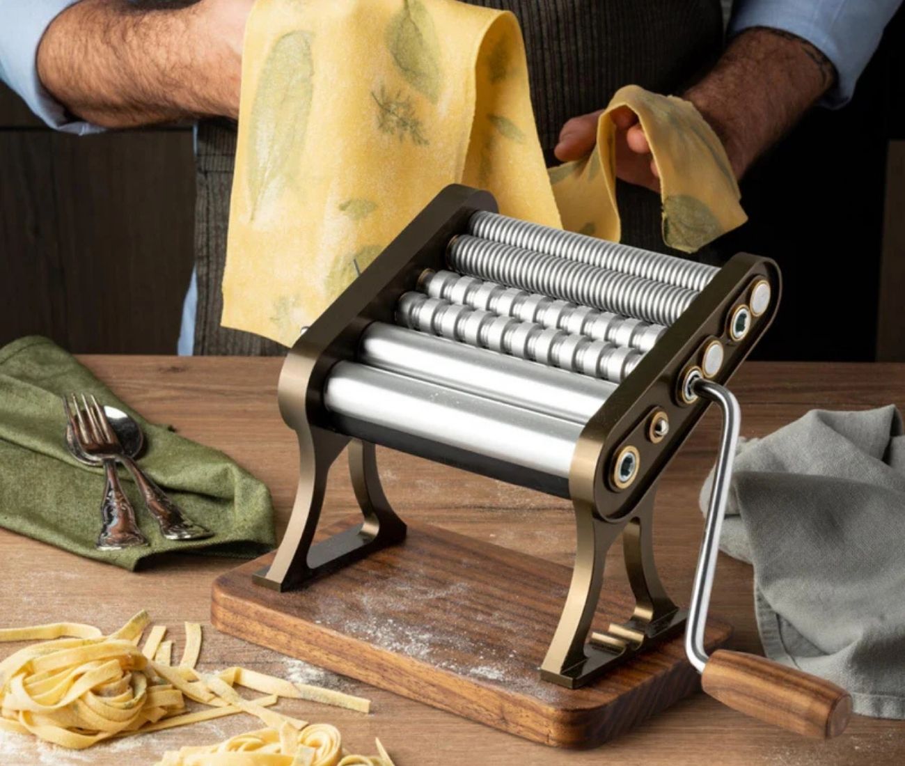 Az Otello limitált kiadású tésztanyújtója a múlt eleganciáját ötvözi a modern dizájn kifinomultságával. A pezsgőszínű alumíniumból és tömör diófából készült eszköz nemcsak látványos, hanem rendkívül praktikus is: a hétfokozatú szabályozónak köszönhetően többféle vastagságú tésztalapot készíthetünk, legyen szó friss tagliatelléről vagy lasagnéról.