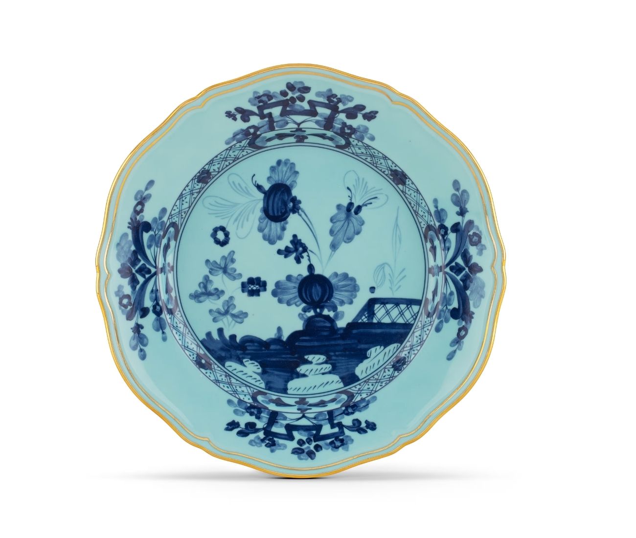 Az ikonikus Antico Doccia forma kontúrjait finom aranyszegély emeli ki, míg a kék szegfűmotívum az íriszkék háttéren különleges eleganciát ad minden terítésnek. A tányér a kollekció többi darabjával együtt kreatív, mégis harmonikus kompozíciót alkot, egyszerre idézve meg az olasz kézművesség hagyományát, a keleti motívumok varázsát és a mediterrán szenvedélyt.
