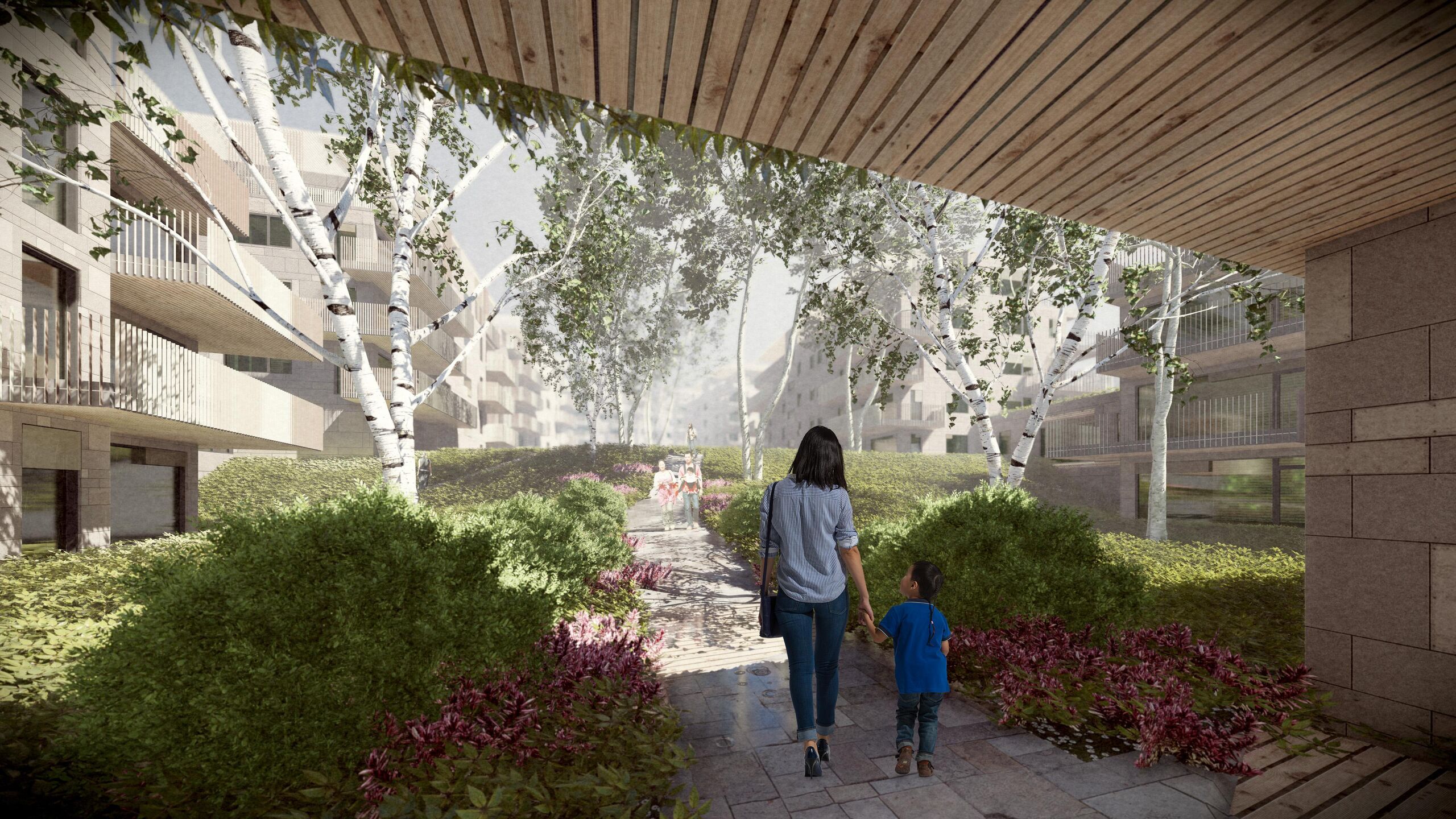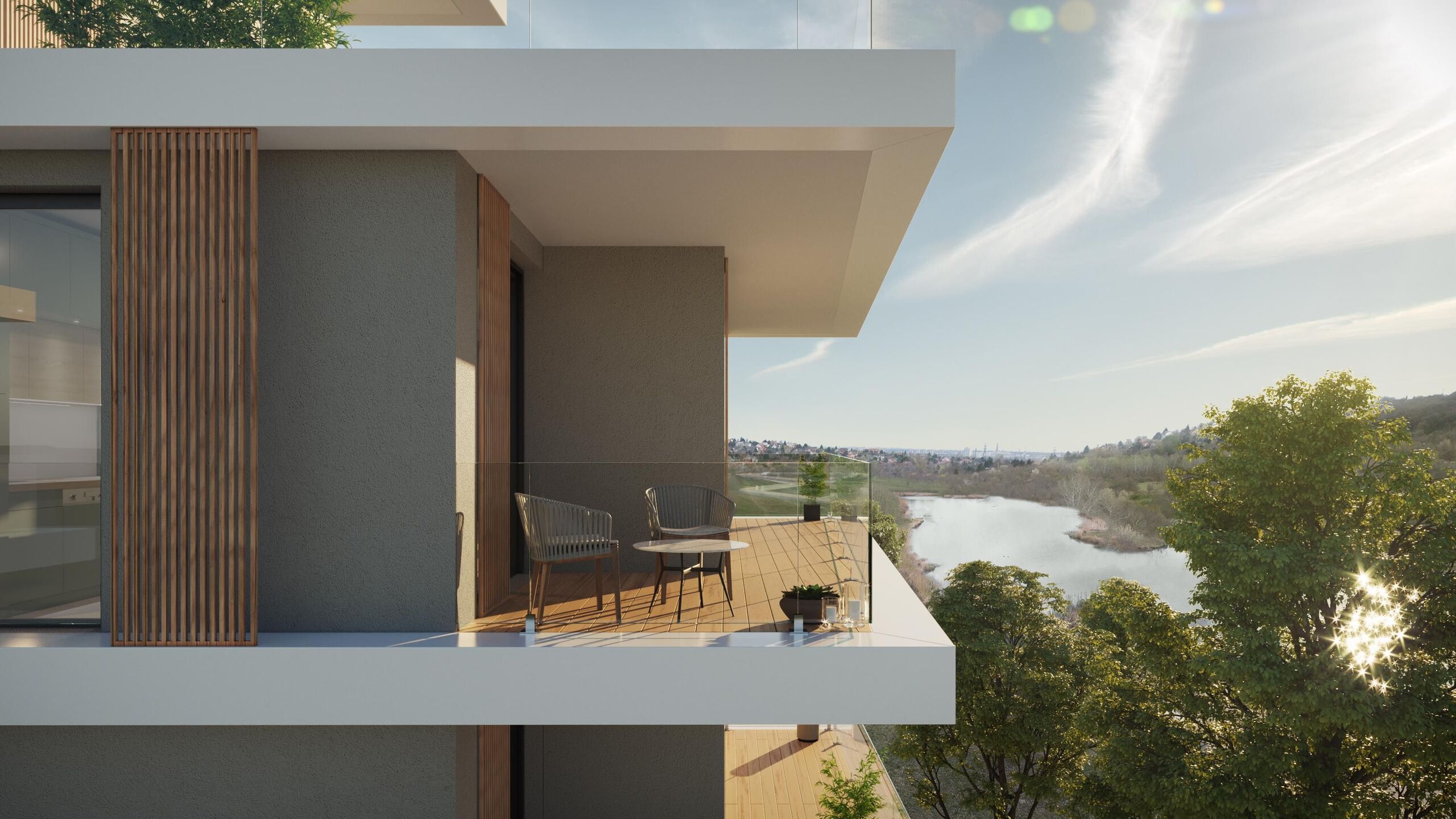 A lakásokból a vízre és a környező budai hegyekre egyaránt kilátás nyílik. Nagyvonalú zöldterületek, a tó partján végigvezető és az egyes épületek között haladó sétányok teremtik meg a táj és a lakókörnyezet szinergiáját. A szerves építészet egyik küldetése teljesedik be az épületek közötti belső kertekben, a zöld tetőkben, a dézsás növényekkel ellátott teraszokban. A természet és az építészeti elemek együttműködése azonban nemcsak a látvány szintjén szolgálja az embert.