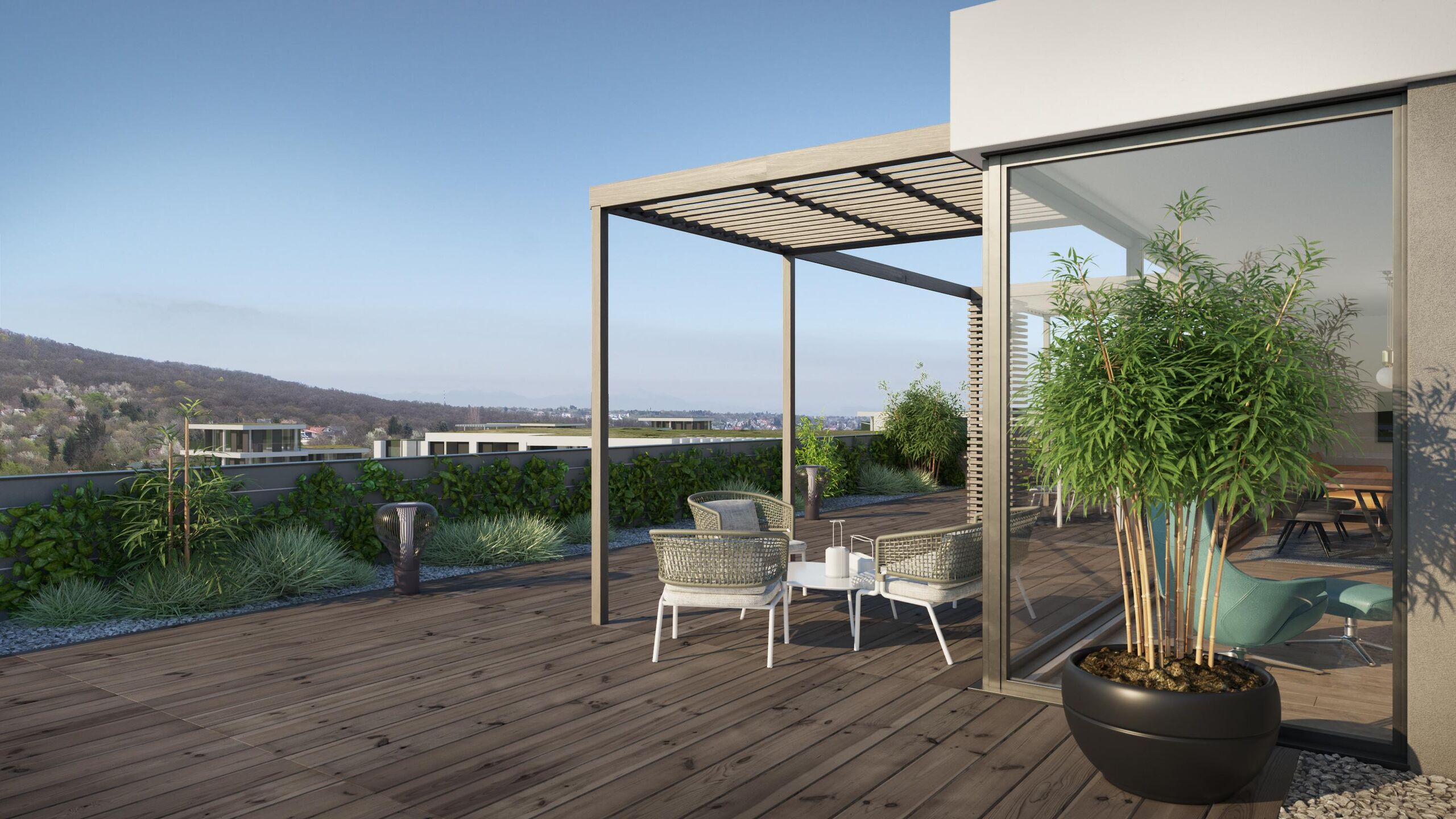 Igyekeztük megtalálni az egyensúlyt a beépítettség és a zöld területek között, illetve arra is figyeltünk, hogy az épületek mérete ne tegye tönkre a zöldövezeti miliőt. A dombtetőn lévő épületek magasabb emeleteiről örökpanoráma nyílik majd a budaörsi hegyekre, de a másik oldalon lévő ablakokból sem a szomszédos lakótömböt kell nézni, hanem a közeli kőérberki zöld dombokat és a mögötte fekvő Kamaraerdőt, mivel a telek adottságainak köszönhetően átlátnak majd fölötte – hasonlóképpen, mint a színházi nézőtéren.