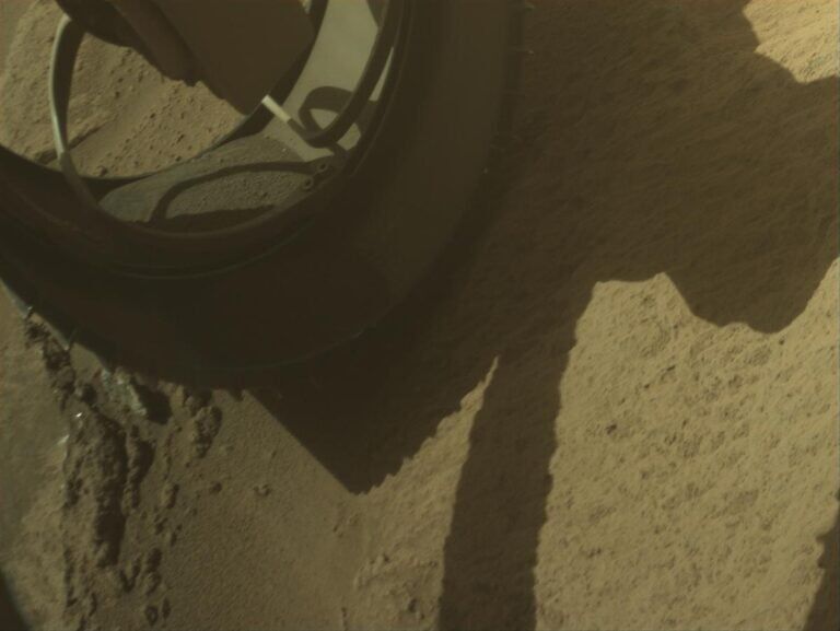 A NASA Mars Perseverance roverje 2023. április 18-án készítette az (üres) kerekéről a képet