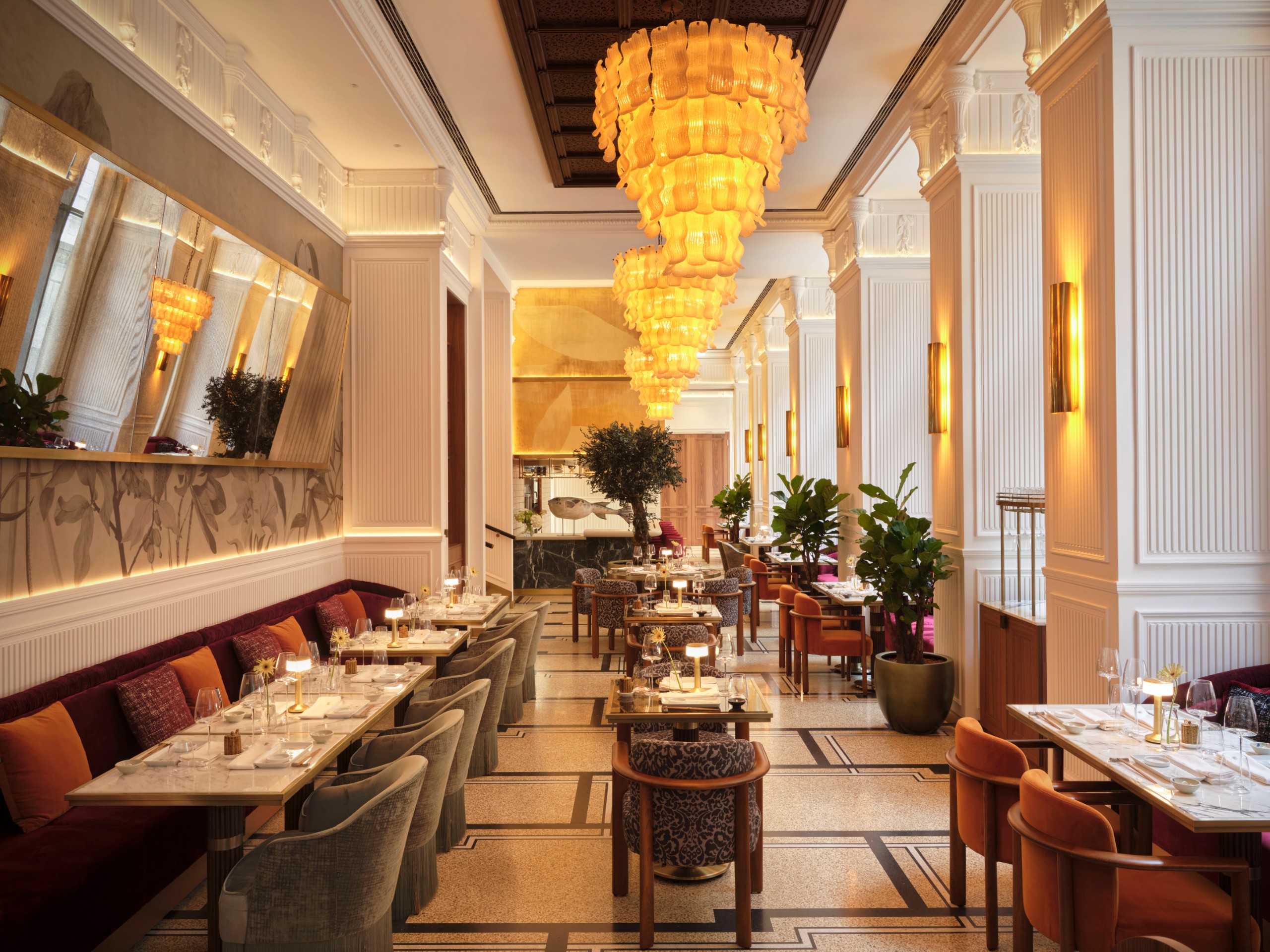 A szálloda belső terei a Duna hullámzását és fényjátékait idézik. Ez a vizuális narratíva végigvonul az egész épületen a lágy kék tónusok, a hullámzó minták és a csillogó felületek révén. Mindezt a magyar fürdőkultúra ihlette részletek – kerámiák, dekoratív csempék és gőzszerű textúrák – egészítik ki. A belsőépítészetben megjelennek a szecesszió jegyei, a bronz részletek és az íves formák, hangsúlyozva Budapest művészeti örökségét. A bejáratnál egy grandiózus lépcsőház fogadja az érkezőket, amelyet egyfajta „függőleges fényfolyóként” álmodtak meg; a látványt szoborszerű kerámiák, tükröződő felületek és egy üvegfödém teszi teljessé, amelyet bronz virágminták és a Szász-Coburg-Gotha-korona ihlette csillárok díszítenek.