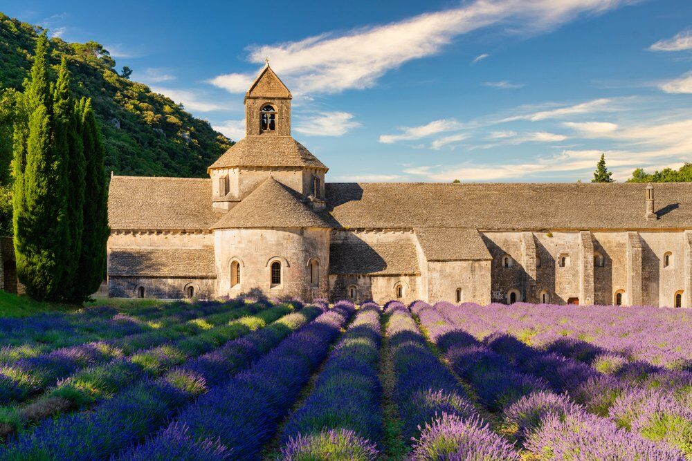 Provence Luberon régiója híres lila levendulamezőiről, melyek megillatosítják a levegőt − és lenyűgöző látványt is nyújtanak − az Abbaye Notre-Dame de Sénanque előtt. Az épület a ciszterci kolostorok ékes példája, benne és a kerengőben vezetett túrákat is tartanak.
