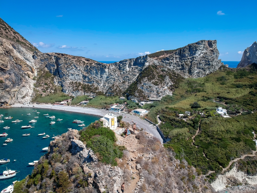 A táj ősidők óta alig változott. A sziklafalak fekete csíkjai ma is az obszidiánt idézik – azt a természetes, üvegszerű vulkáni kőzetet, amelyből az őskorban éles pengéket és szerszámokat készítettek, és amely miatt már több ezer éve is felkeresték a szigetet. A rómaiak stratégiai megfigyelőpontként használták a térséget, de soha nem telepítették be. A 18. századtól Palmarola magántulajdonba került, ponzai családok között felosztva; a sziklába vájt barlangokat vihar idején menedékként használták, és sokan ma is felszerelve tartják őket.
