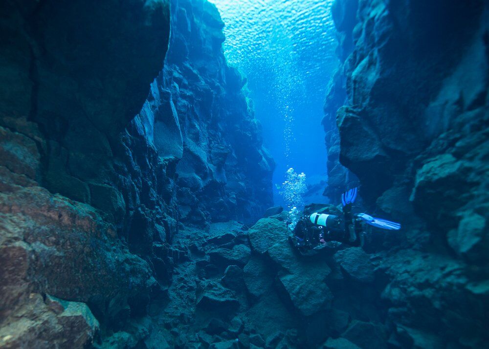 Az izlandi Thingvellir Nemzeti Parkban található Silfra-hasadék az eurázsiai és az észak-amerikai kontinentális lemezek között húzódik. A helyszín kifejezetten népszerű az édesvízi búvárok körében, a hasadék pedig annyira keskeny, hogy ha egészen az aljáig merülünk, akkor mindkét kontinenst egyszerre érinthetjük meg. Ez azonban nem lesz így örökké, a Silfra két oldala ugyanis évente két centiméterrel távolodik egymástól.